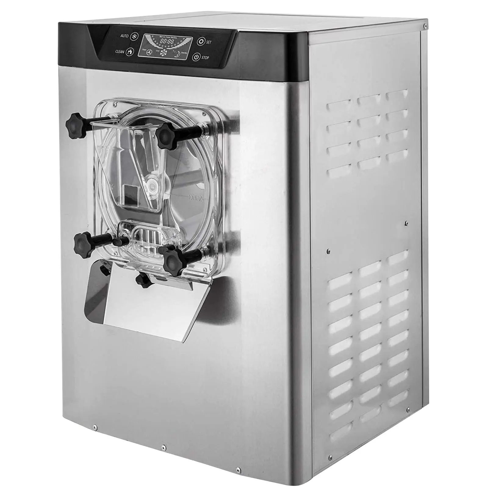 • Intelligent LCD Panel: This hard serve ice cream maker is equipped with a practical panel in slope design, with which you don't need to bend over to operate any longer. It integrates multiple functions, such as auto refrigeration, one-click cleaning, time setting, etc. The display screen can also show you the production time and quantity remaining.
