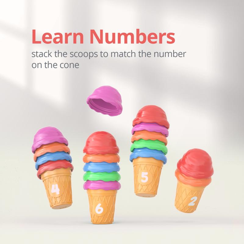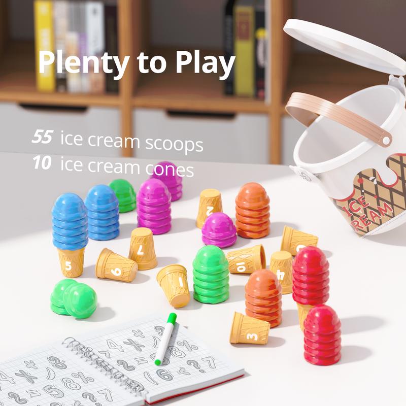 ·Fun Ice Cream Play Set: Number Ice cream toys includes 20 or 55 ice cream scoops and 10 ice cream cones with numbers 1-10 printed on them. Rich accessories support you to learn numbers and counting by stacking the corresponding number of scoops on the cones.