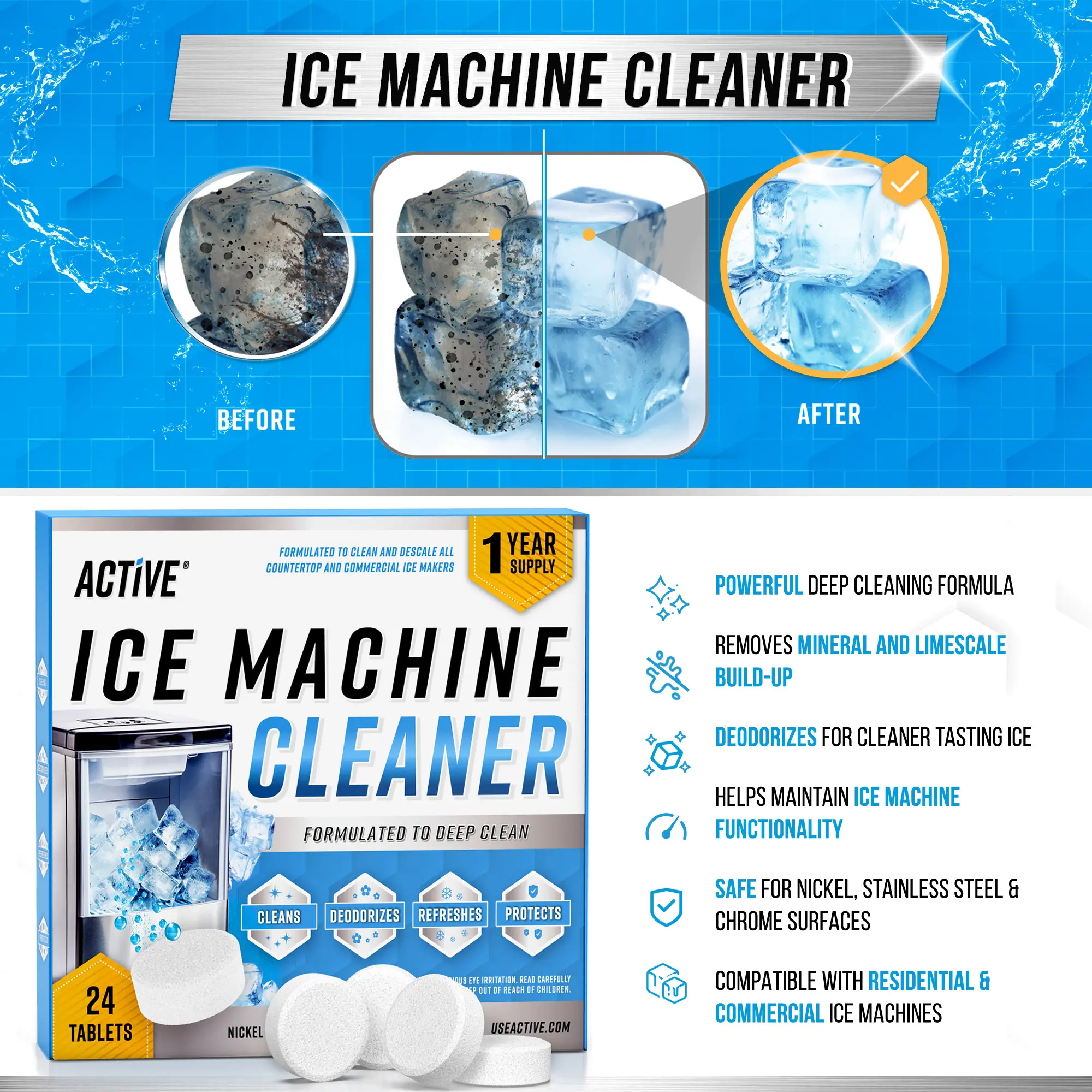 ยทPowerful Nickel-Safe Descaling: ACTIVE Ice Machine Cleaner and Descaler is made from Food Grade Citric Acid and other Simple Ingredients that won't harm metals such as nickel, stainless steel, and aluminum plated components inside your self cleaning ice maker! Tablets are specially formulated to target the hard water, calcium buildup, and limescale that build up in your machine