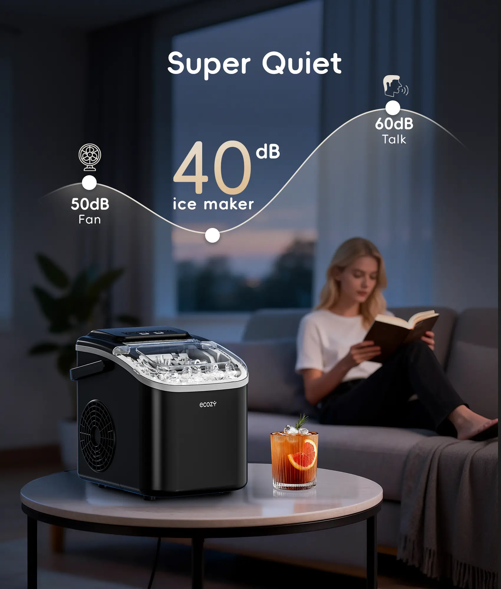 Experience ice-making tranquility with this whisper-quiet machine, under 35dB, comparable to a running fridge. Infrared sensors stop ice production when full, and a low water reminder makes it stress-free
