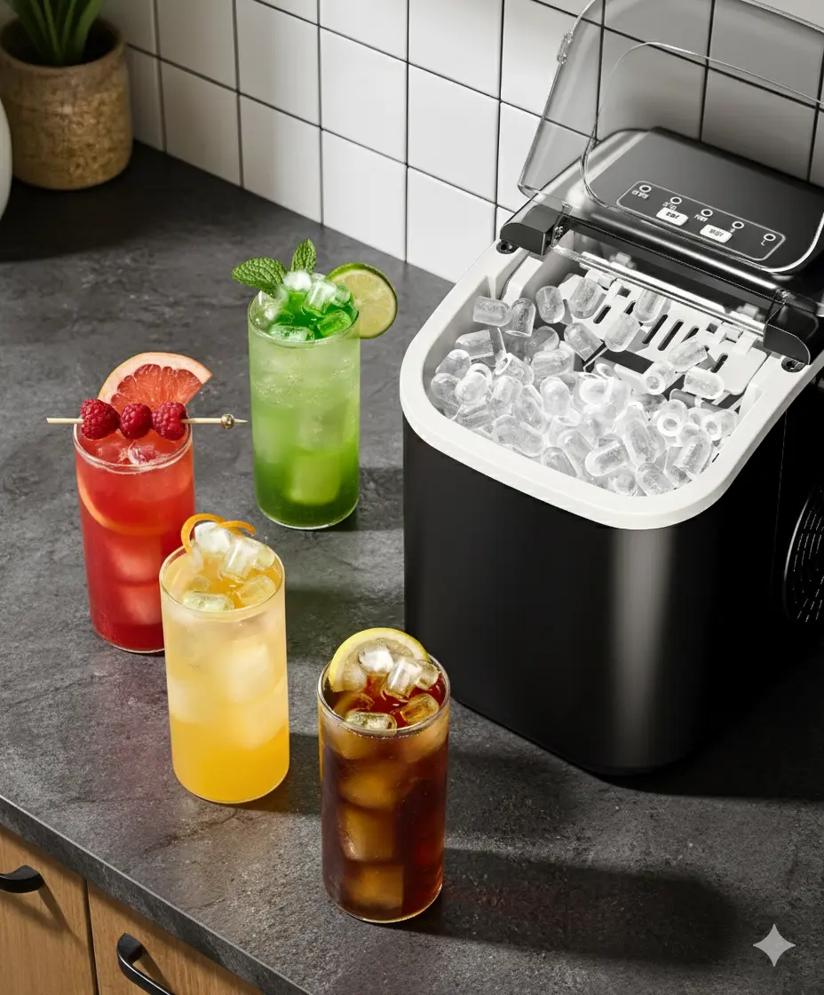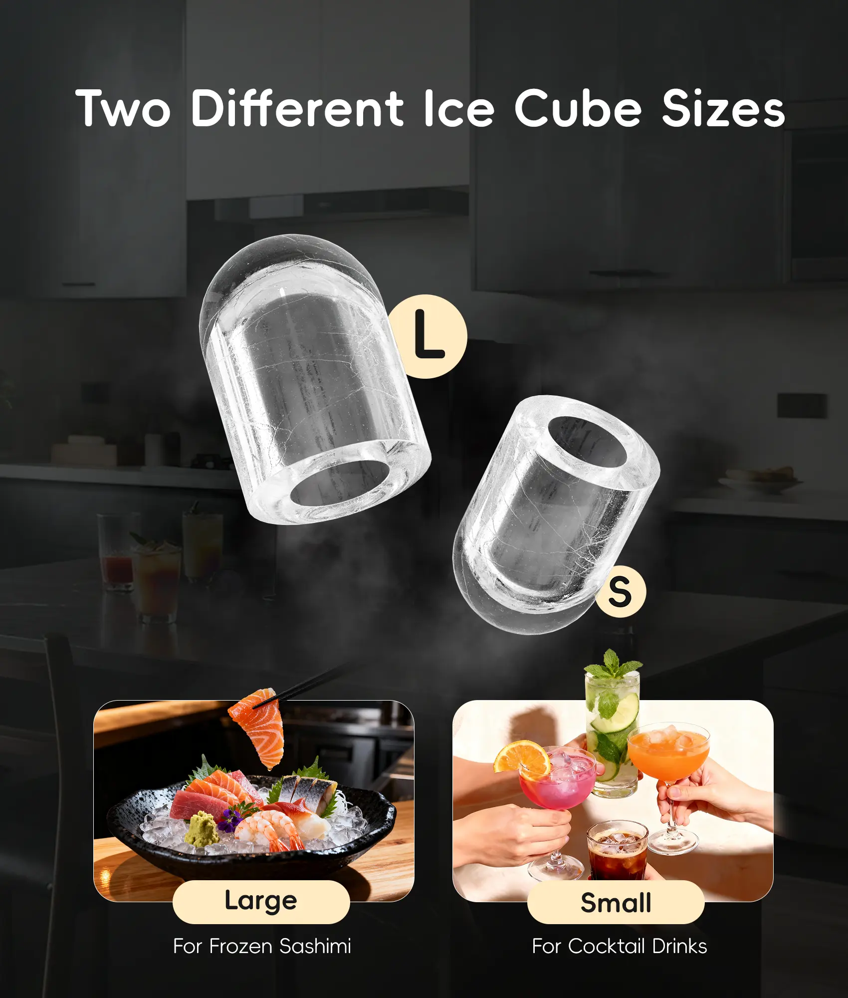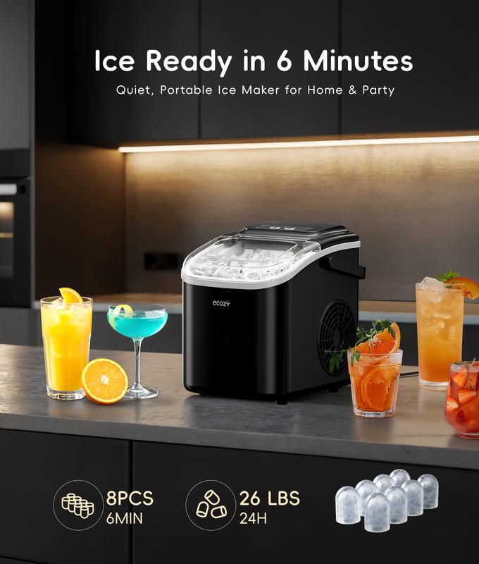 Enjoy perfect ice in a flash with this countertop ice maker. With 6-minute cycles, get 8 bullet-shaped ice cubes at a time and produce up to 26lbs of ice per day.