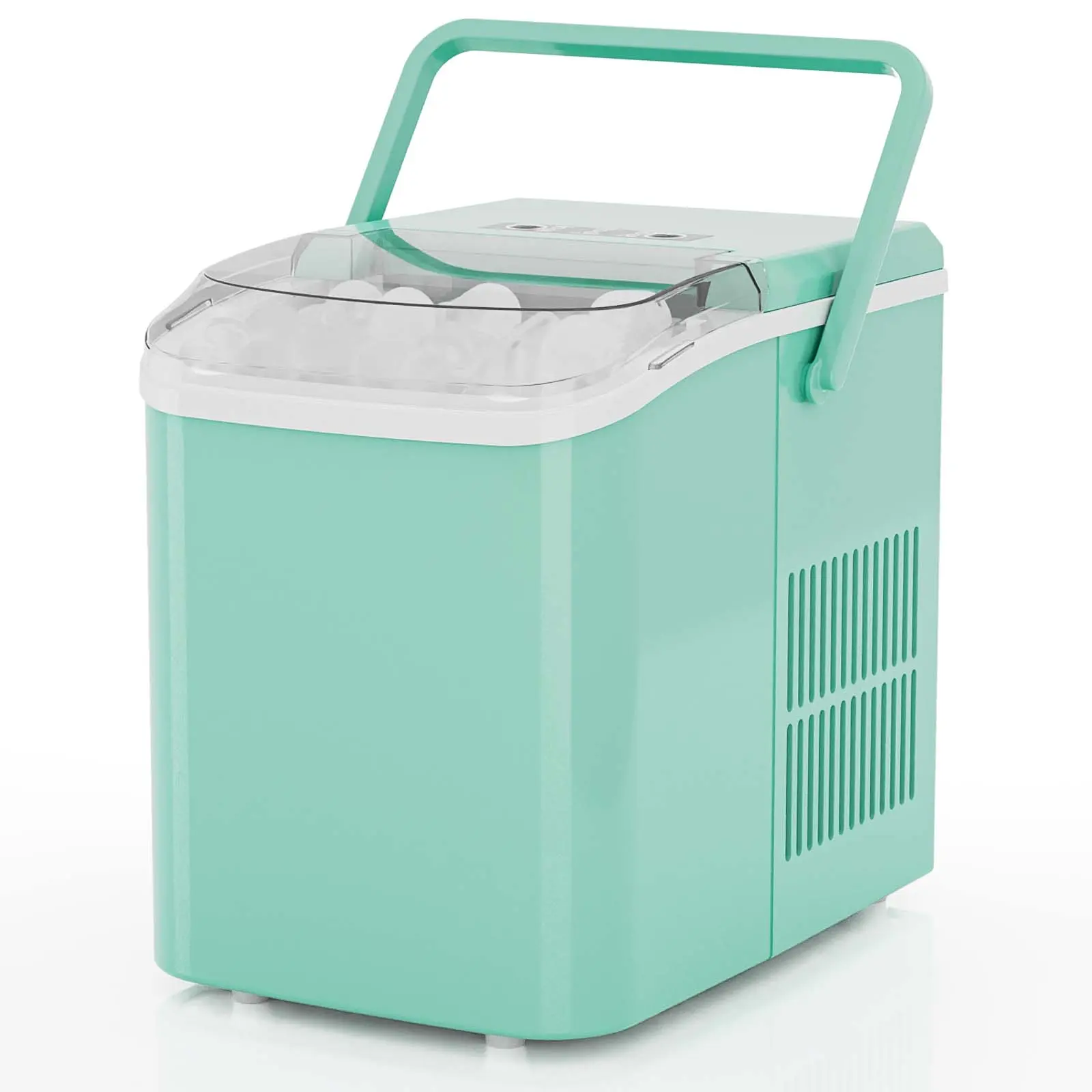 ·【PORTABLE ICE MAKER】This counter top ice machine maker weighs 15.4 pounds and is designed with a convenient carry handle. The small ice maker measures 8.8*11.6*12.5 inches. You can place the mini portable ice maker countertop anywhere, perfect for the kitchen, office, bar, camping, RV, or parties.
