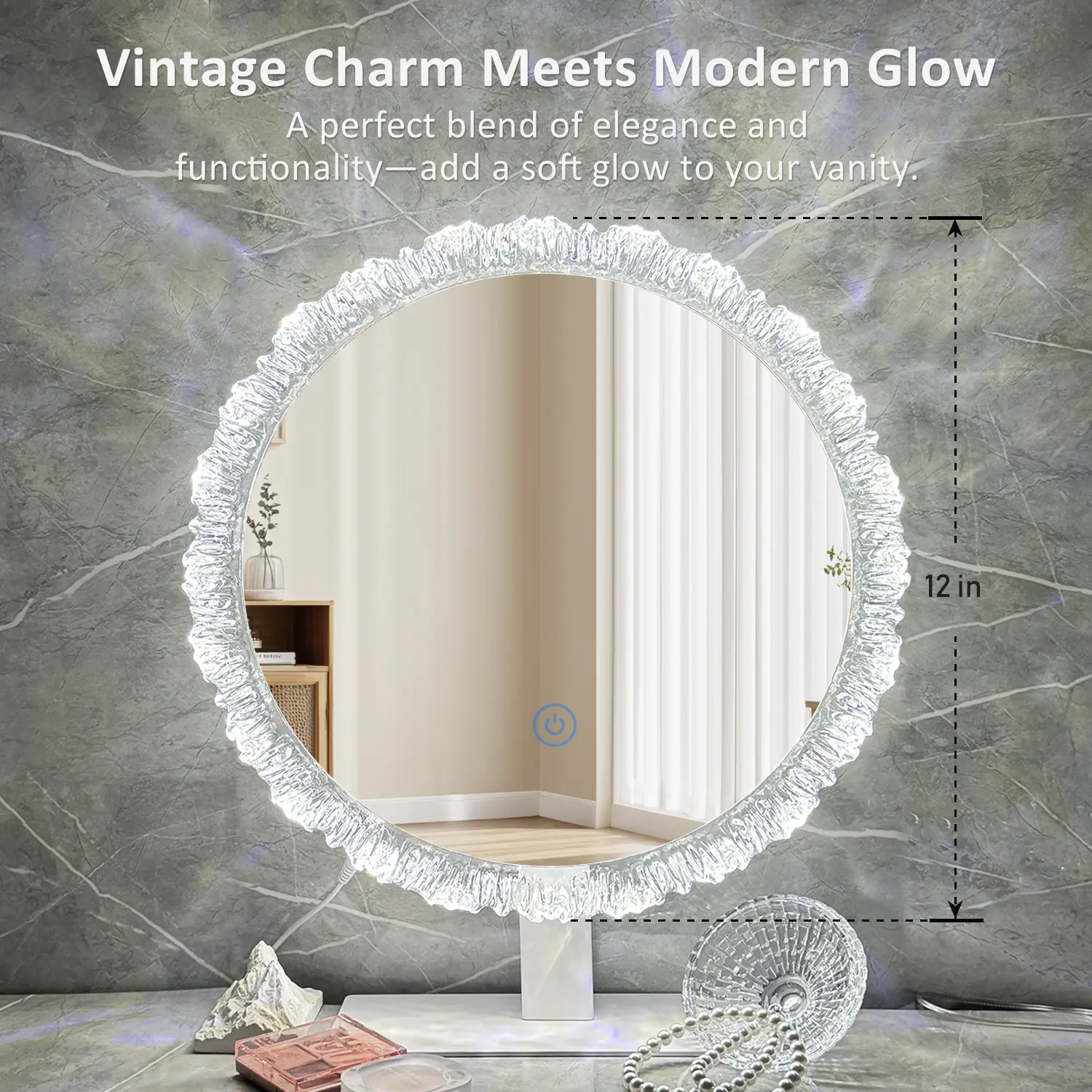 A mirror that feels like a dream. Inspired by serene beauty and vintage lace, this round vanity mirror features a unique edge that lights up like a halo. The gentle LED glow transforms your space into a cozy, calming retreat. Perfect for slow mornings or elegant nights in.