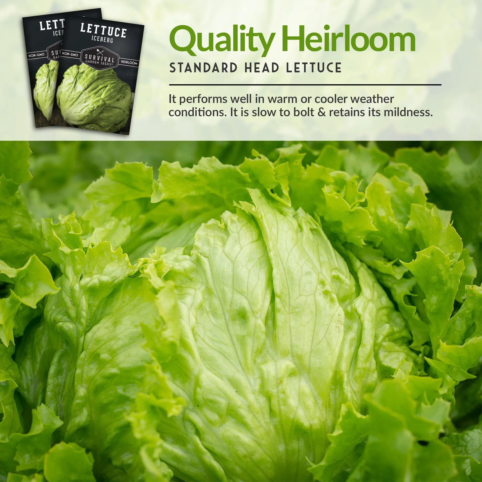 ·Quality Heirloom - Gardeners keep returning to Iceberg as a standard head lettuce. It performs well in warm or cooler weather conditions. It is slow to bolt and retains its mildness.
