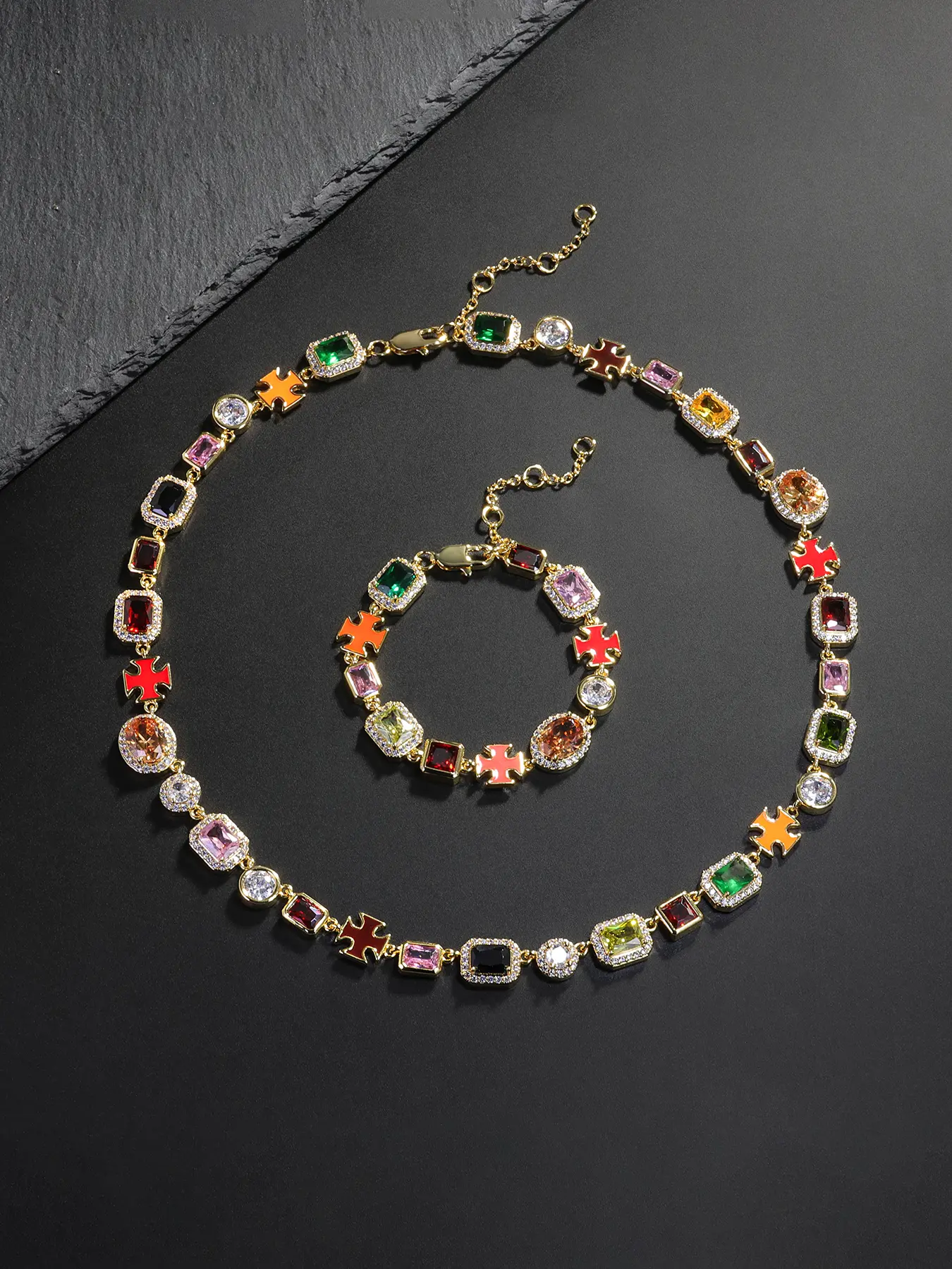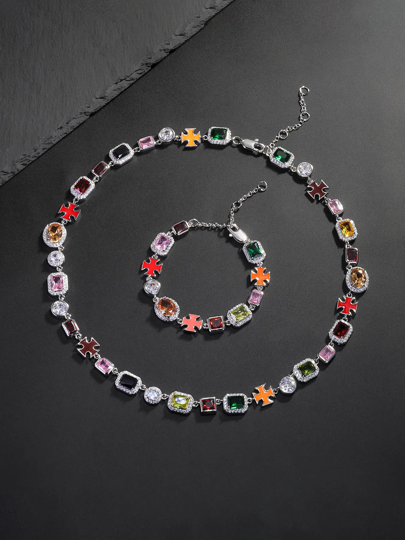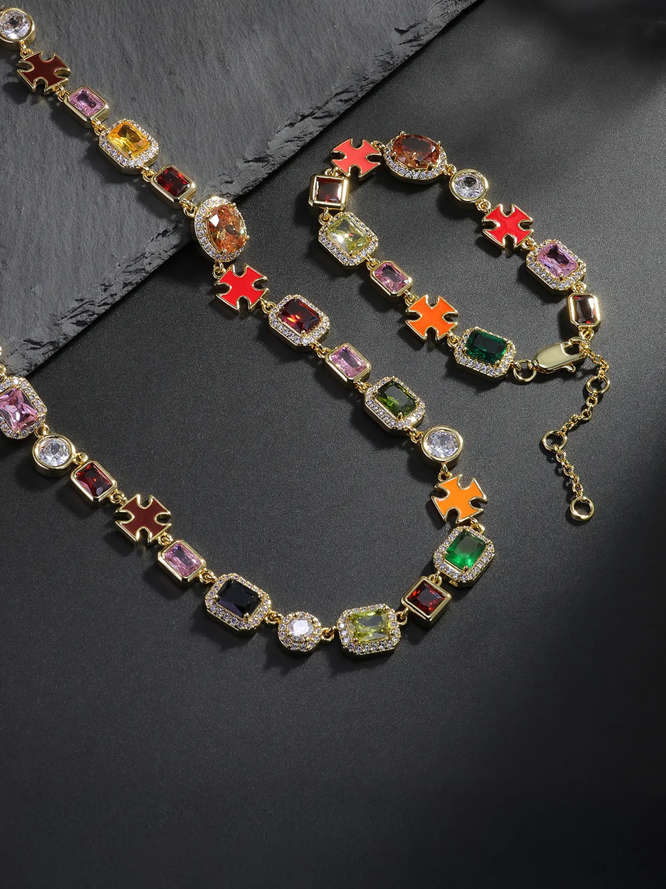 Iced Chics 2pcs/set Necklace Bracelet Set, Zirconia Jewelry Set, Colorful Zircon Cross Drip Pendant, Hip Hop Street Style, Unisex, Perfect Gift, All Seasons