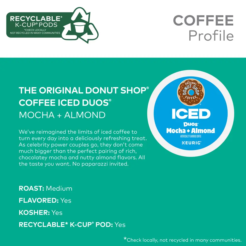 Chocolatey mocha and the nutty flavor of almonds are great on their own, but together they’re even better … and a whole lot cooler! The Original Donut Shop® Coffee Iced Duos® Mocha + Almond coffee blends two flavors that complement each other, as well as the roast of the beans, giving you a uniquely delicious experience in every cup. We blend rich chocolate mocha flavor with notes of toasted almonds that come together in a sweet duet of delicious, perfectly roasted harmony that’s chilled to perfection when served over ice. It’s the mocha chocolate and toasted almond combination you’ll go nuts for! These medium roast, caffeinated K-Cup® pods are engineered for guaranteed quality. Each Iced Duos® K-Cup® pod is compatible with any Keurig® single-serve coffee maker and designed to stand up to ice. To brew, fill a large tumbler with ice. DO NOT use glass. Brew on the 8 oz size or use the Strong or Iced button, if available, for a bigger flavor. Add milk, sweetener, and more ice to taste, if desired, and enjoy! Simple. Delicious. And recyclable*. Enjoy the same great-tasting coffee you know and love, and when you’re done, just peel, empty, and recycle. *Check locally. Not recycled in many communities.