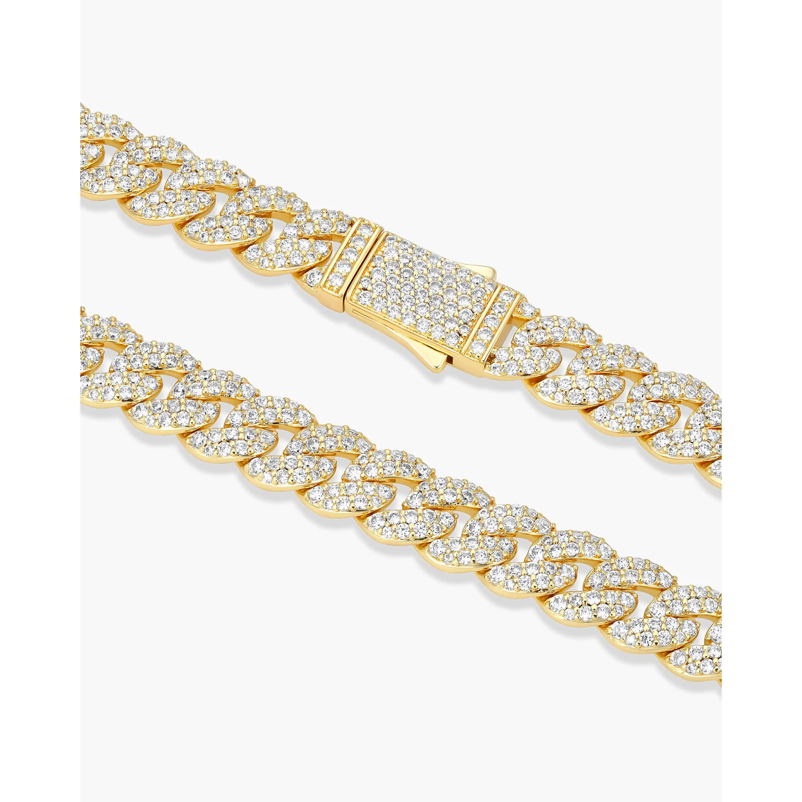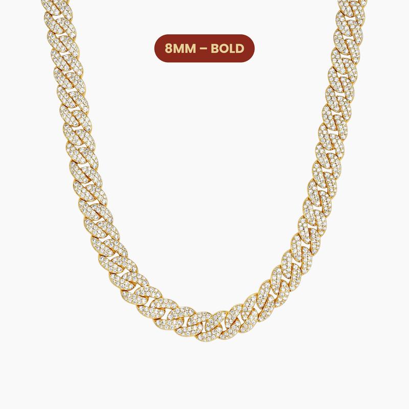 Our best-selling 8mm Cuban Link Chain is just got an upgrade - now dripping in flawless diamond simulant stones that shine from every angle. This piece is perfectly positioned between our popular 5mm and 10mm options, offering the ideal balance of boldness and subtlety without sacrificing style.