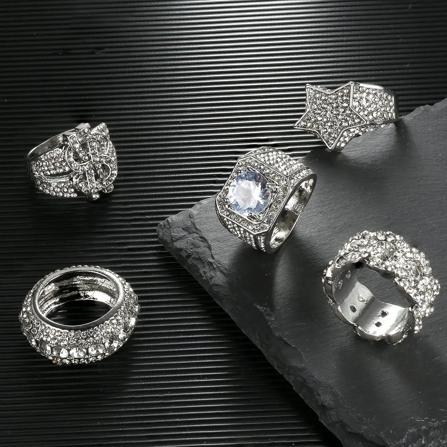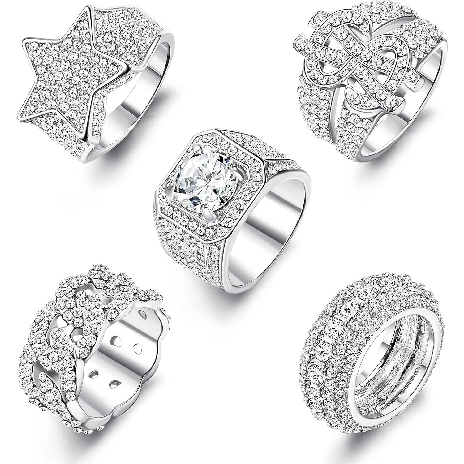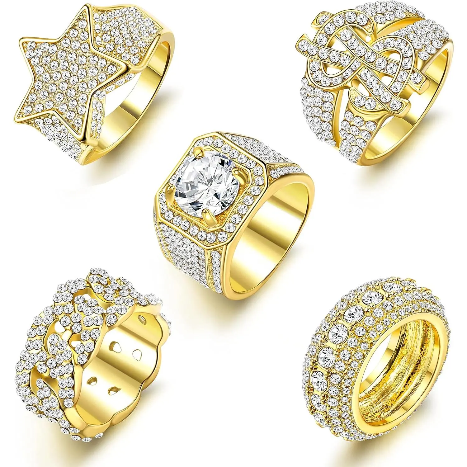 ·Iced Out Ring for Men: One order includes 5pcs exquisite men's iced out rings: 5 rows iced out ring, iced out cuban link ring, 3D star punky rappers ring, hip hop big US dollar sign ring and diamond ring iced out. These sparkling rings look better on the hand than seen in the pictures, showing character and luxury.