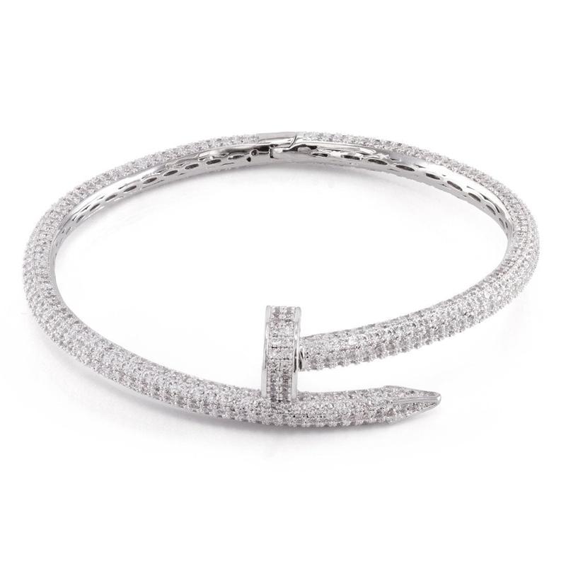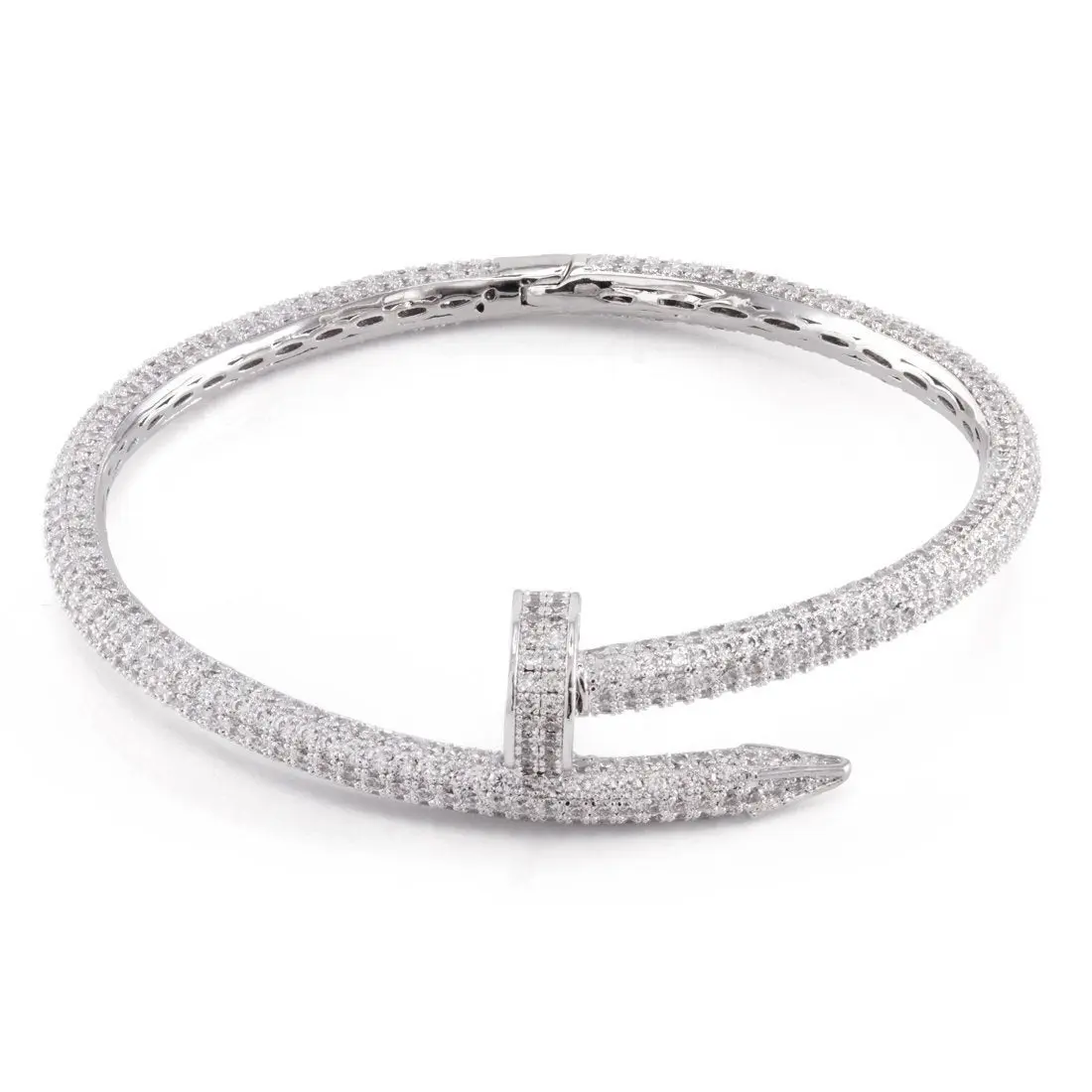 Plated to perfection, each Iced Studded Nail Bracelet comes lined with VVS Diamond Simulate Stones to provide a classic look. Available plated in 14K Gold or White Gold.