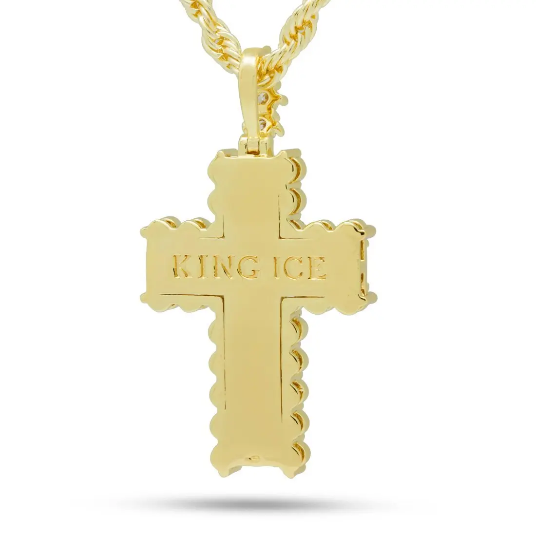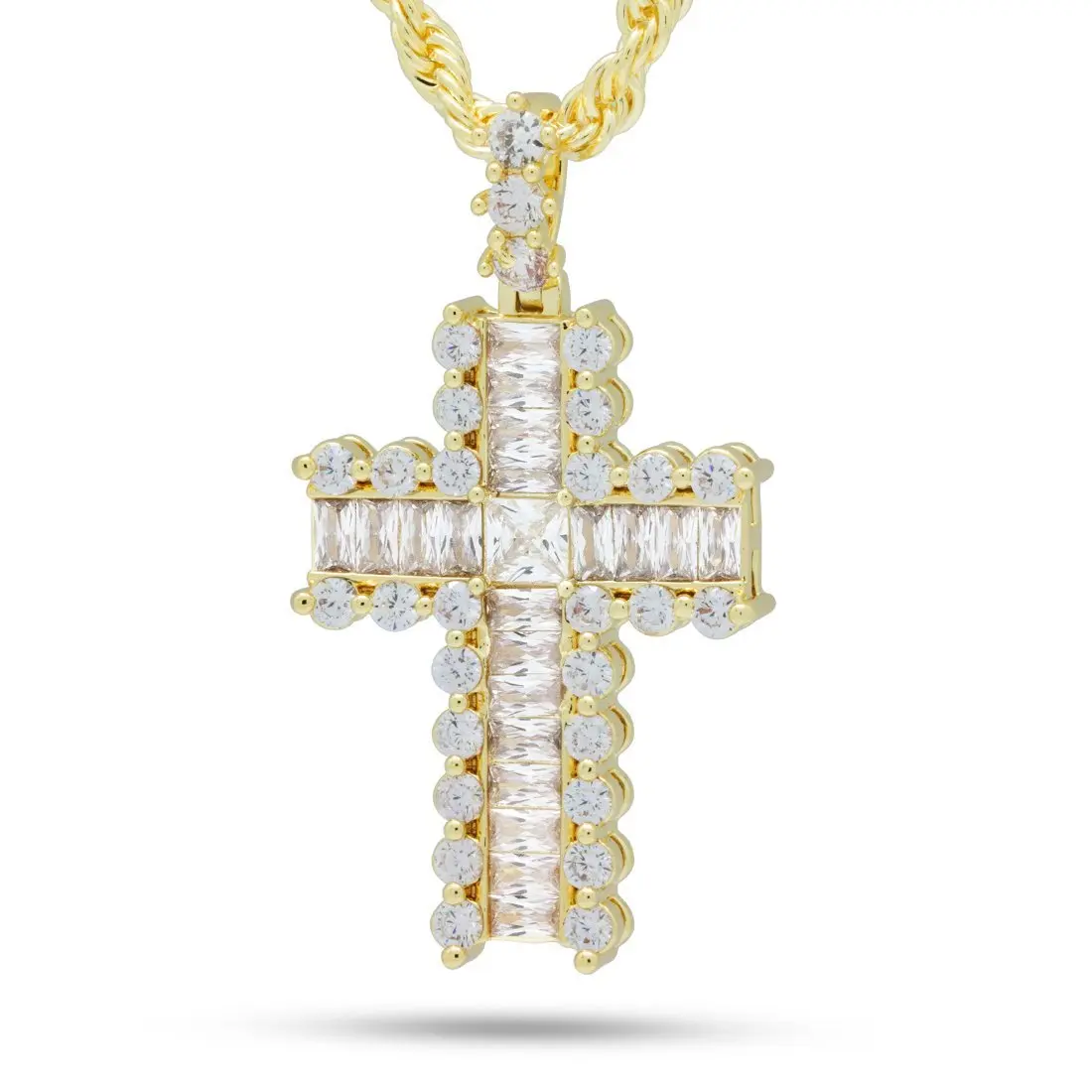 The new Icy Cross Necklace is exactly that, icy. Each necklace is decked out with clear VVS Diamond Simulates in round and emerald shapes. All necklaces are plated with a 14K Gold finish for a flossy finish. A 4mm, 20" Rope Chain accompanies each cross.