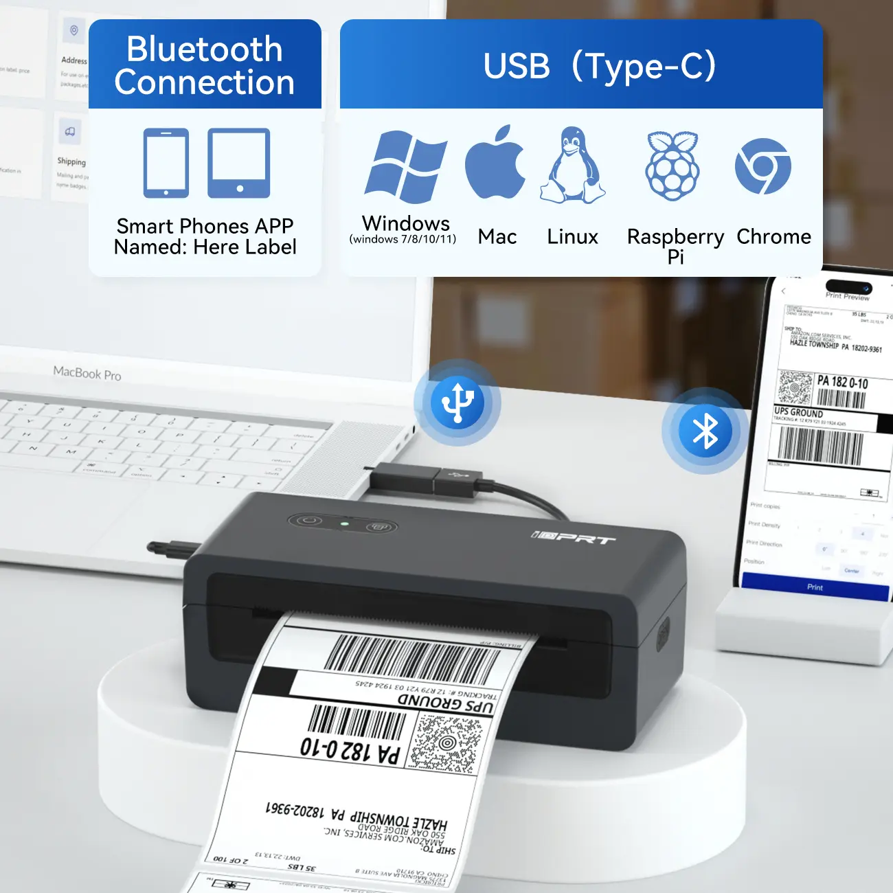 ·Mobile connection - Download the "HereLabel" application to print on thermal label printers for iPhone (iOS) and Android via Bluetooth.