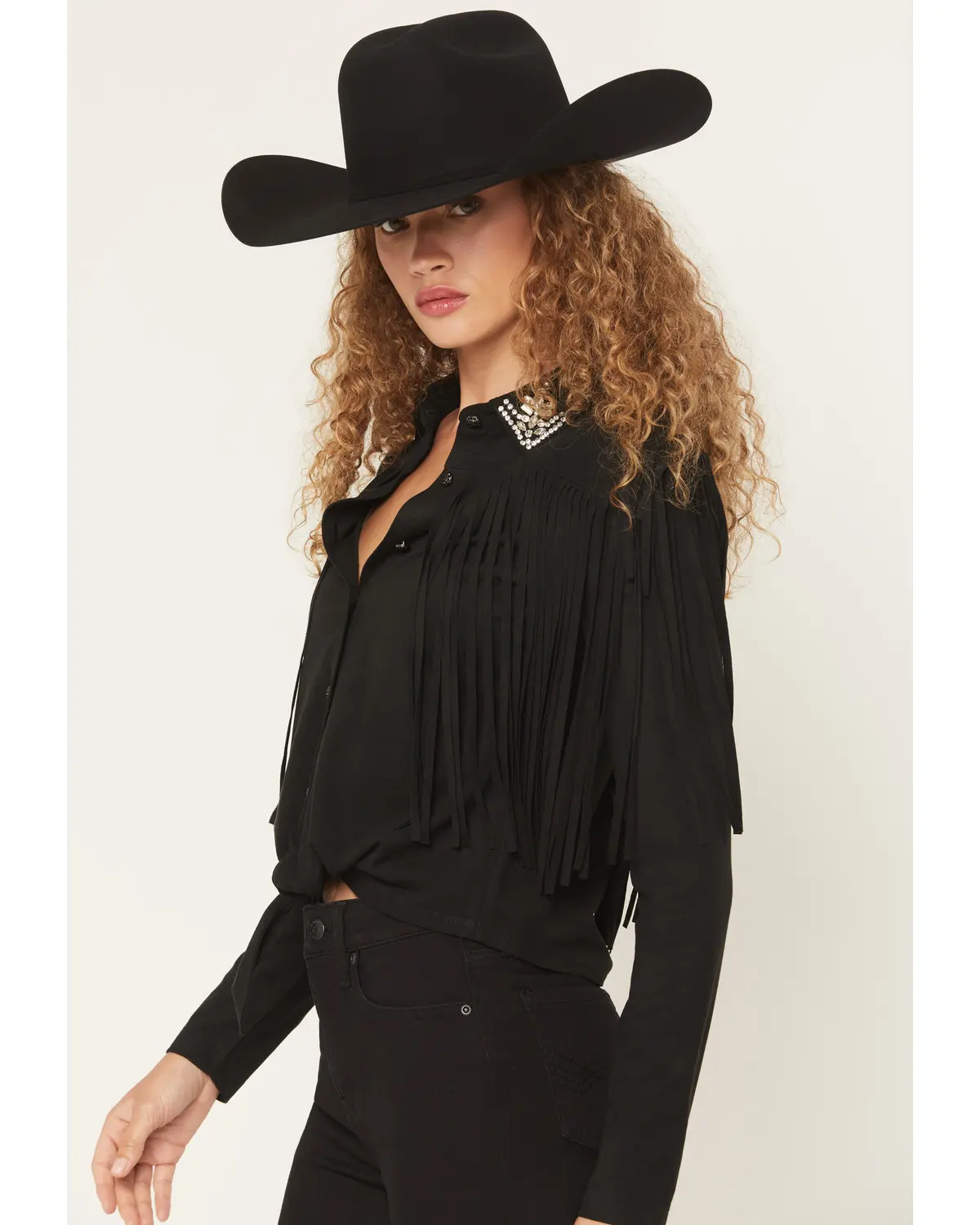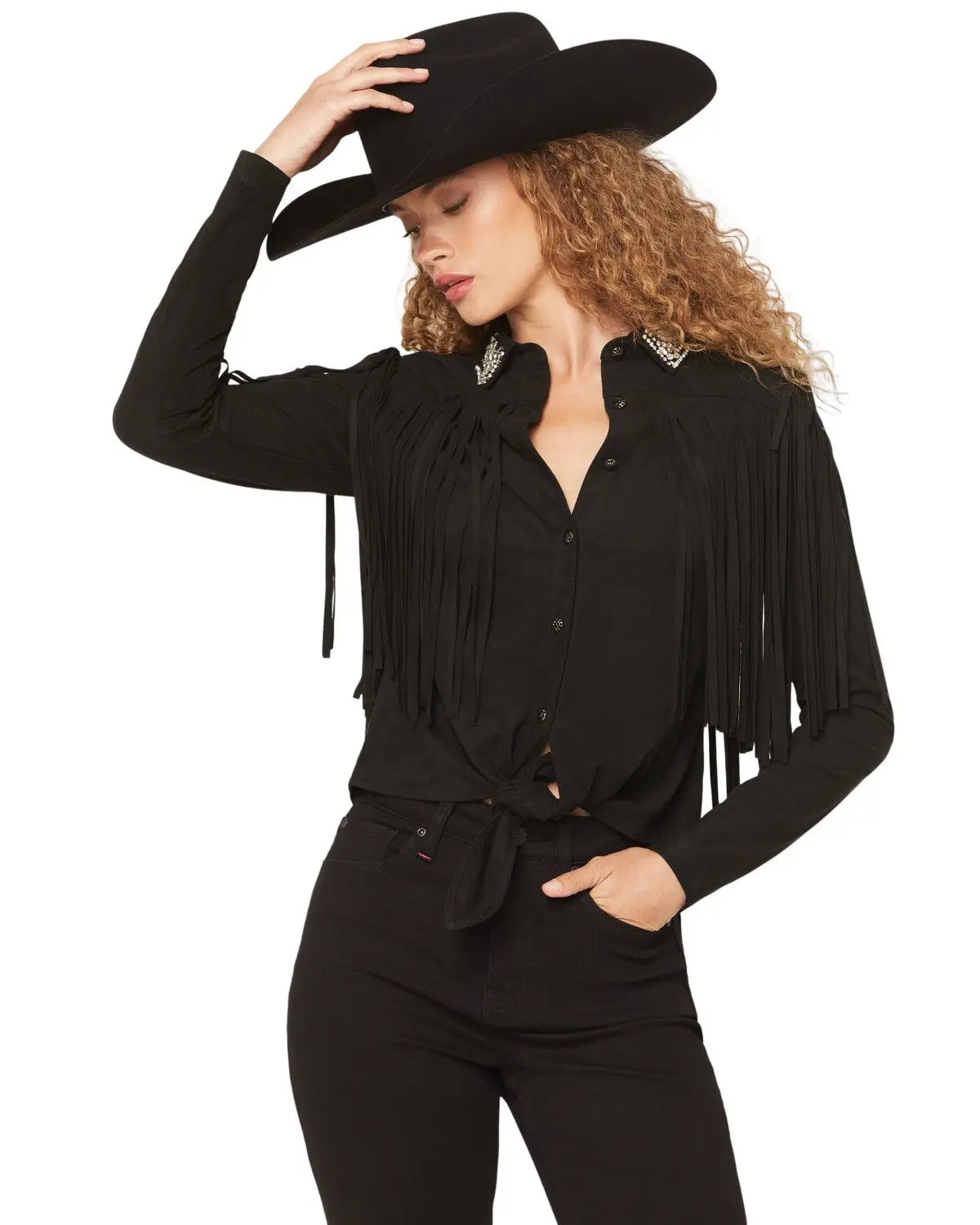 Idyllwind Women's Twinpines Faux Suede Fringe Embellished Long Sleeve - Iwho25k15-Blk