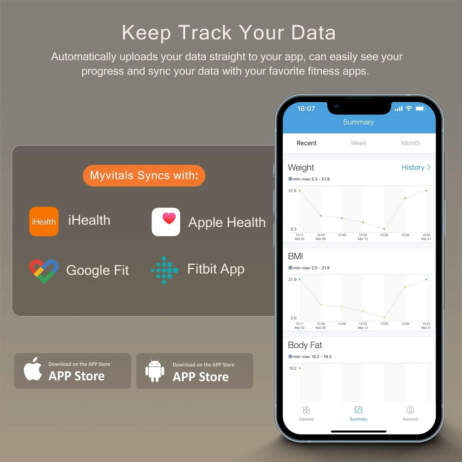 ·Track Your Progress - Sync with the MyVitals app to monitor trends in graphs daily, weekly, or monthly.