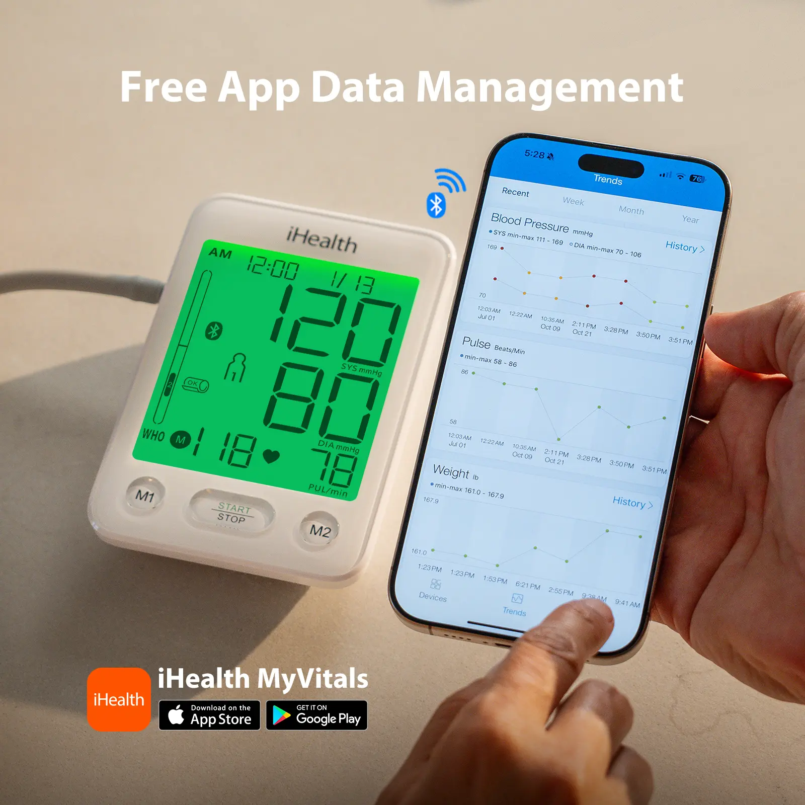 ·Bluetooth Blood Pressure Monitor: Sync effortlessly with the free iHealth MyVitals app (ensure your app is up to date) on iOS or Android. Designed for two users, each can store up to 120 readings with unlimited cloud storage. The app automatically generates trend charts for blood pressure and heart rate, making it easy to share reports with your doctor anytime. Whether tracking your own or your parent’s health, iHealth makes monitoring simple.