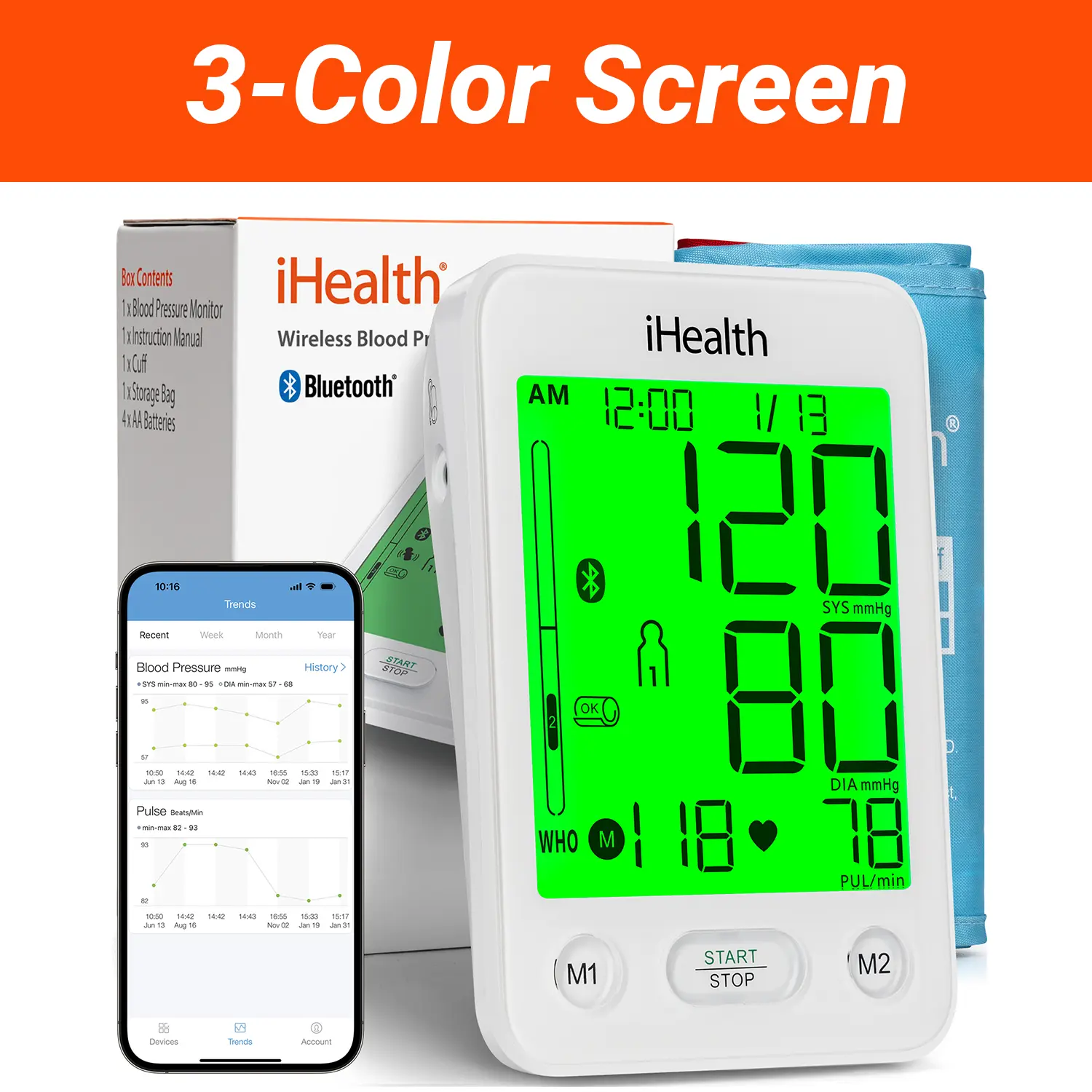 ·Larger and Clearer: This upgraded iHealth monitor features a 4.5-inch LCD screen—larger than other models—providing a three-color backlight that instantly shows your blood pressure level (green, orange, red) according to WHO guidelines. It also includes arrhythmia detection with separate alerts for better heart health tracking. The large display and intuitive design make it easy to use, delivering quick results.