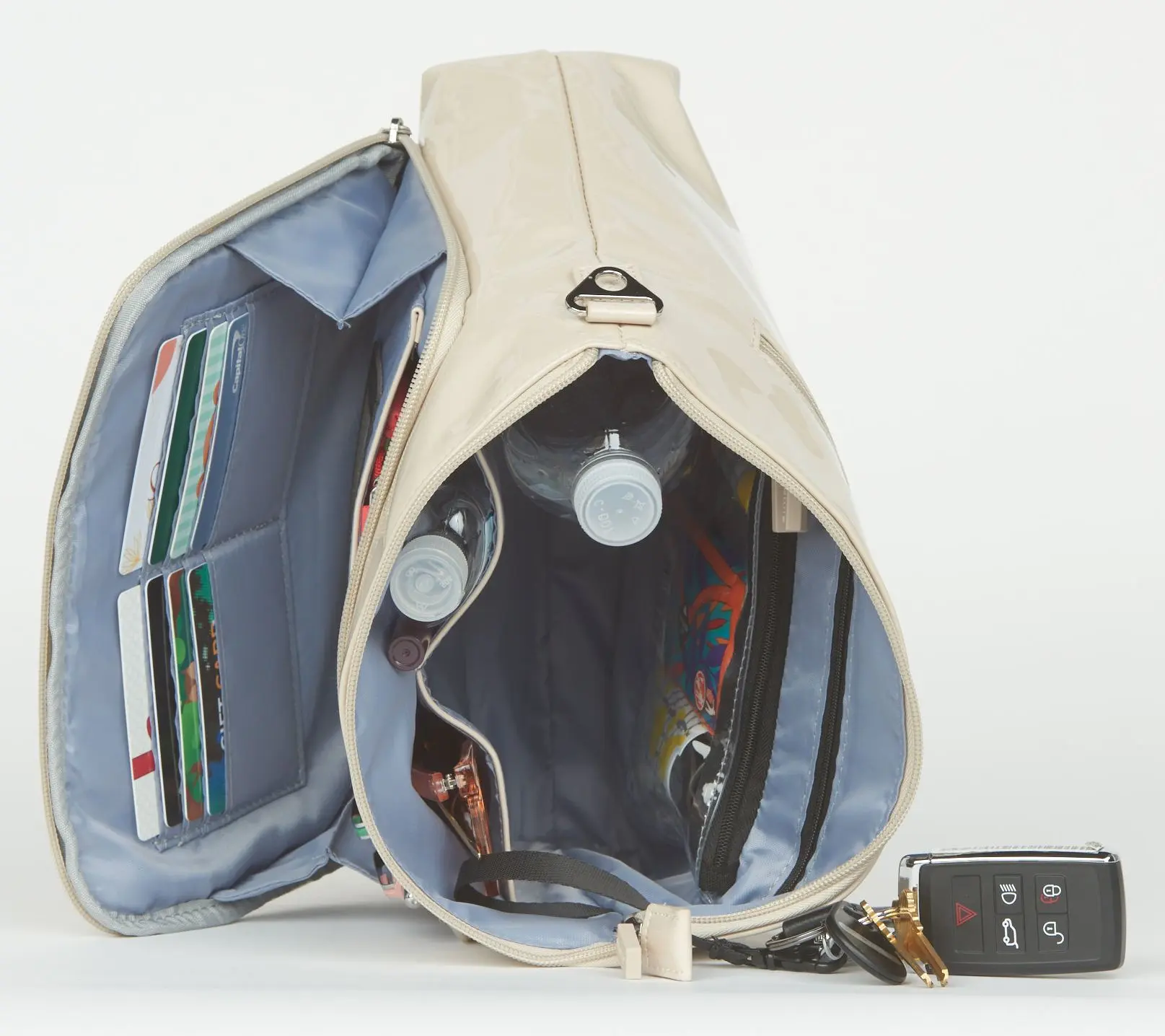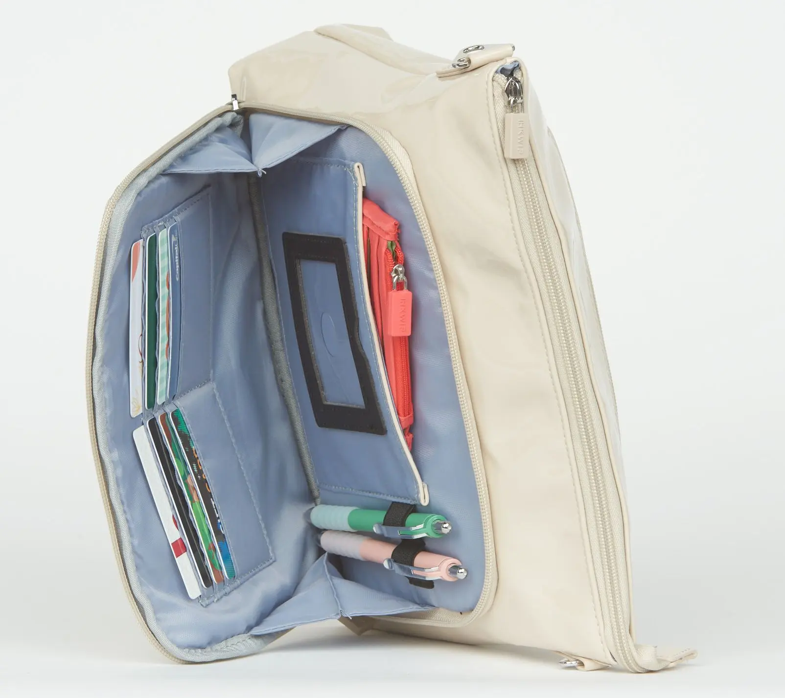 ·Lined interior; built-in RFID wallet with card slots, cash sleeve, and ID window; phone and glasses pocket with two pen slots; clear-view pocket; bottle holder