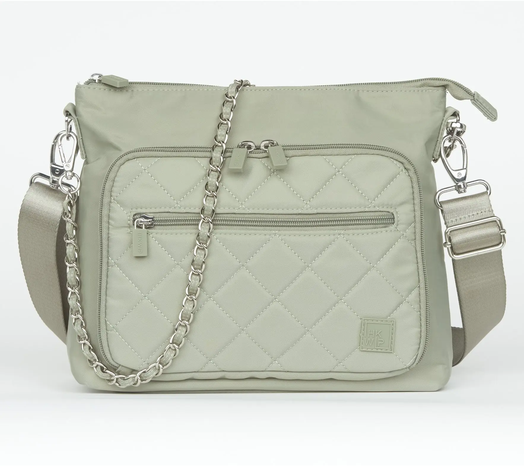 ·Water-repellent exterior, adjustable/removable crossbody strap, adjustable/removable chain shoulder strap, front gusseted dual zip pocket, rear zip pocket, purse feet