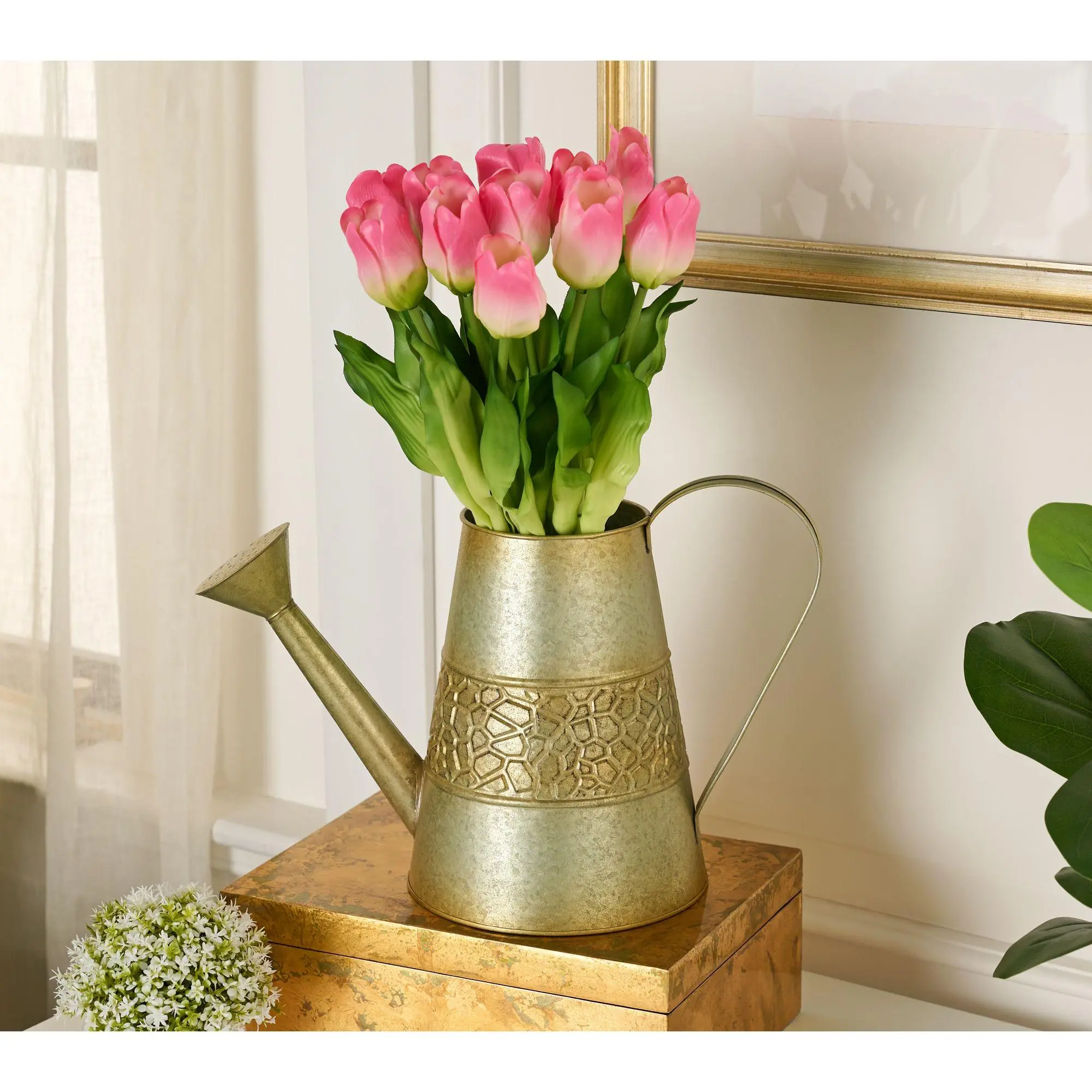 Wow! These tulips look so real! And the watering can is pretty in rustic style. I love love love that the tulips are not attached so I can use different vase if I feel like it. This arrangement looks so high-end, I am very happy I got it.