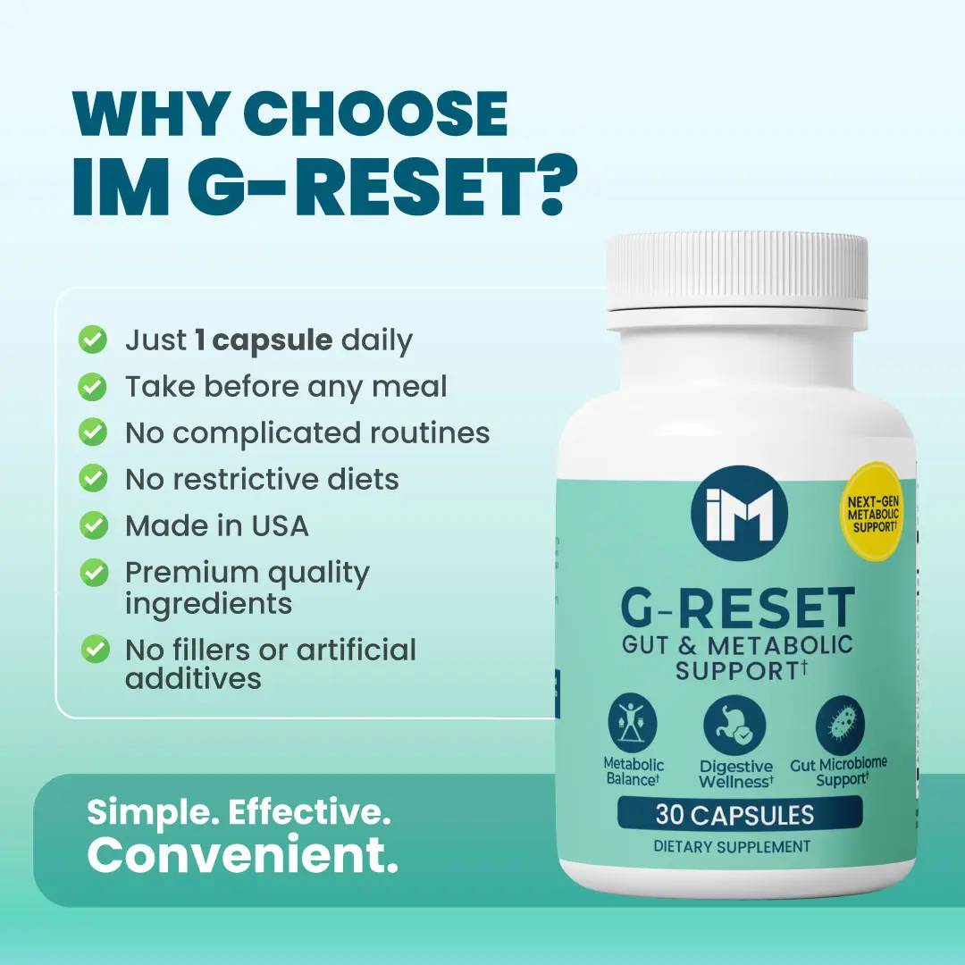 IM G-Reset is a next-generation formula designed to promote digestive wellness, metabolic balance, and microbiome support — all in one daily capsule. Packed with probiotics, botanicals, and antioxidants, it’s your easy step toward feeling balanced from the inside out.
