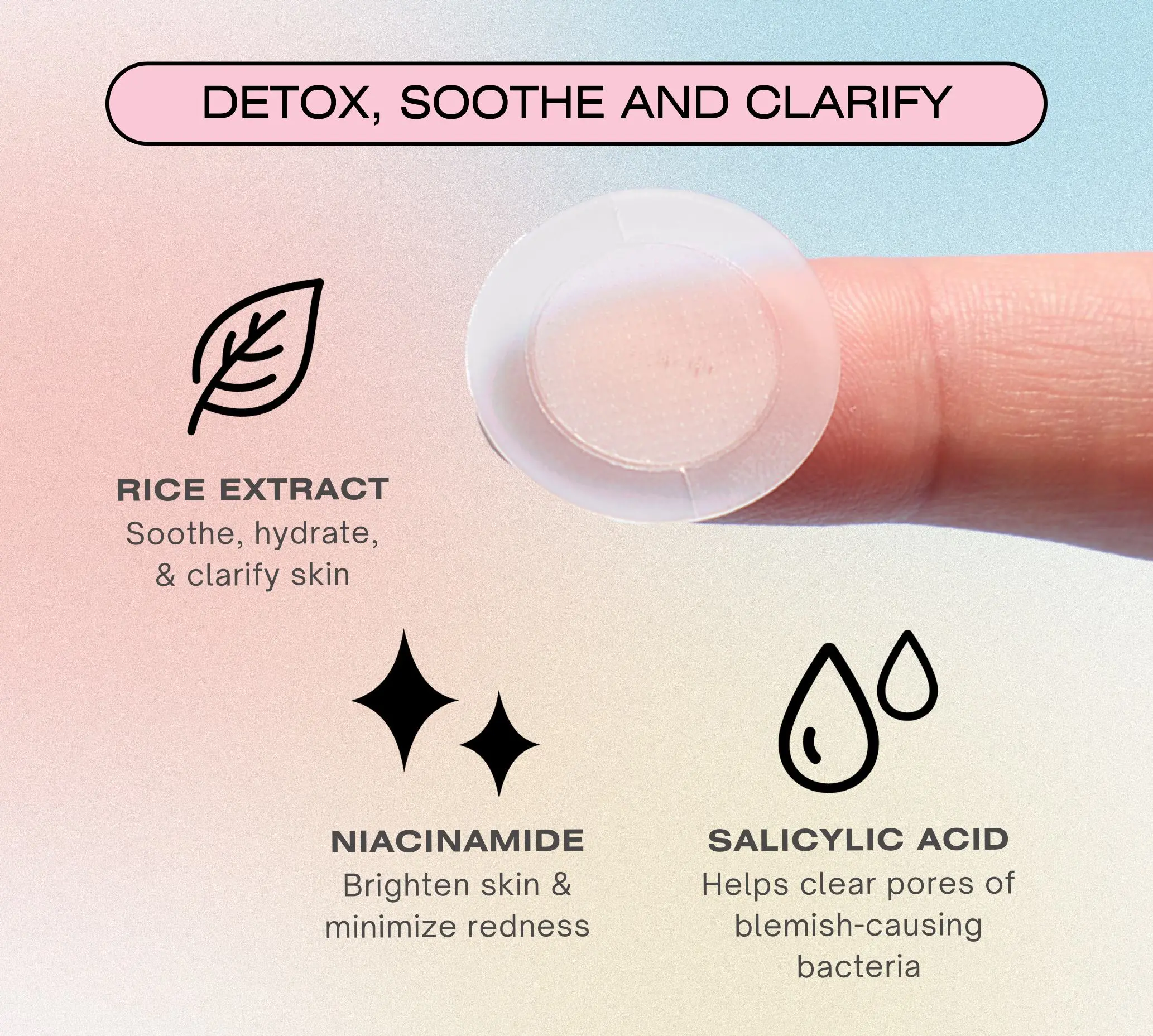 ·Apply the patch to the blemish you wish to treat. Gently press down on the middle of the patch for 4-5 seconds to activate the microneedle effect.