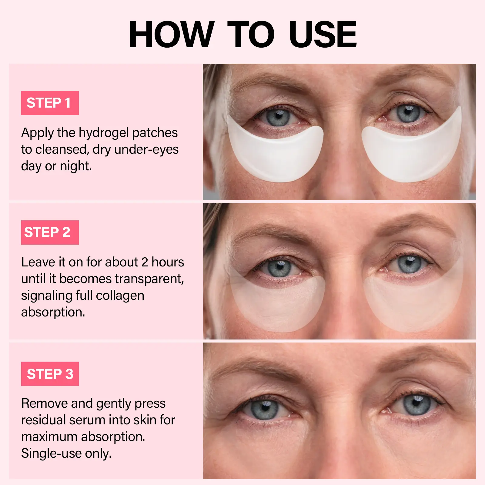 ·How to Use: Apply the eye hydrogel patches to cleansed, dry under-eyes day or night. Leave on for about 2 hours until transparent, signaling full collagen absorption. Remove and gently press residual serum into the skin for maximum absorption. Single-use only. TIP: No time during the day? Apply at bedtime, leave on overnight and discard in the morning.