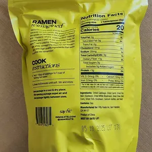 I have to wonder about the labeling. How does this collection of freeze dried plant products have so little fiber? I also have to wonder about the inclusion of corn as a ramen topping. Whose idea is that? If immi is all about protein, why include the sugar and starch? Cabbage, carrot, chive, soy all make sense, but corn? Ditch the corn, please. It adds nothing to the product.