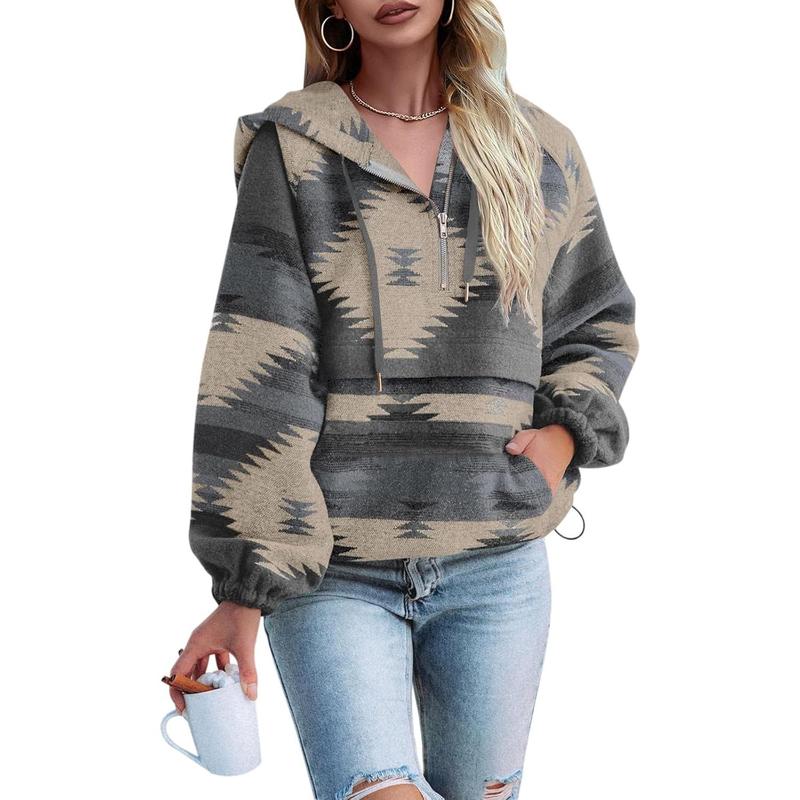 Womens Aztec Hoodie Jacket 1/4 Zip Pullover Drawstring Sweatshirt with Pocket