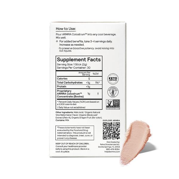 Vine Watermelon: Proprietary ARMRA Colostrum Concentrate (Bovine), Malic Acid, Organic Natural Watermelon Flavoring, Organic Stevia Leaf Extract, Dragon Fruit (Hylocereus undatus) (for color). Contains: Milk.