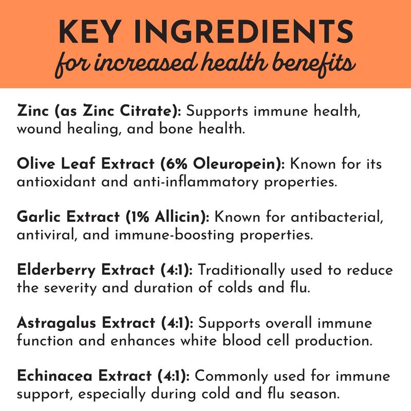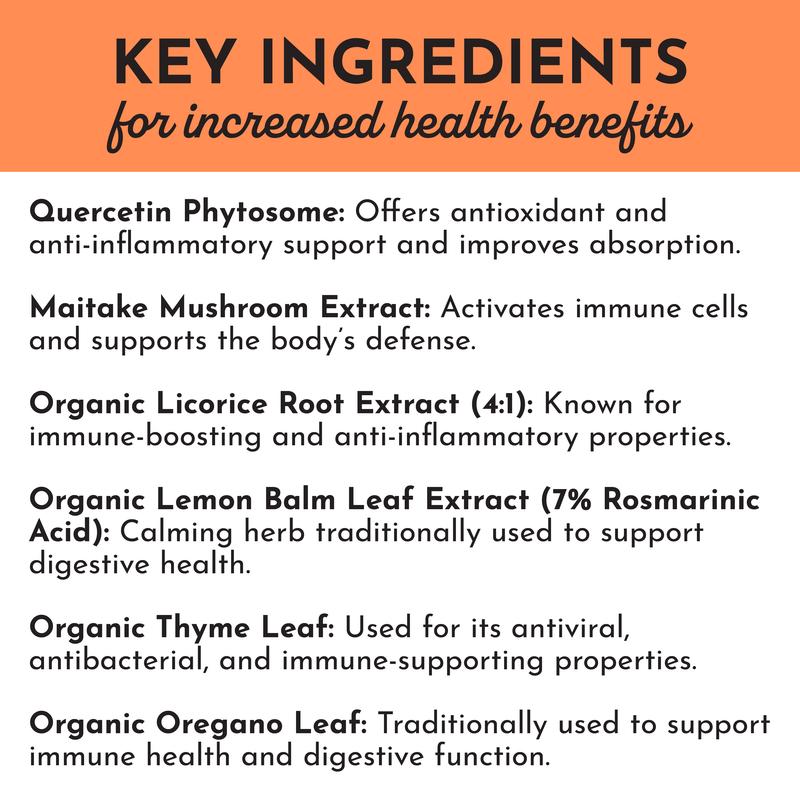 IngredientsOrganic Bamboo Extract,Coconut MCT Oil with Acacia Fiber,Hypromellose (Vegetable Capsule),Organic Oregano (Origanum vulgare) Leaf,Organic Thyme (Thymus vulgaris) Leaf,Organic Licorice (Glycyrrhiza glabra) Root Extract,Organic Lemon Balm (Melissa officinalis L.) Leaf Extract 7% Rosmarinic Acid,Organic Maitake Mushroom (Grifola frondosa) Mycelium / Primordia,Organic Echinacea (Echinacea purpurea) Aerial Extract,Quercetin Phytosome (Sophora japonica L.) Flower Extract,Organic Astragalus (Astragalus membranaceus) Root Extract,Organic Elderberry (Sambucus nigra) Fruit Extract,Garlic (Allium sativum L.) Bulb Extract 1% Allicin,Olive (Olea europaea) Leaf Extract 6% Oleuropein,Zinc (as Zinc Bisglycinate Chelate)
