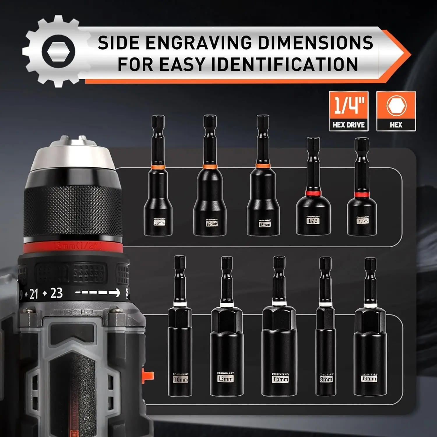 Deep Nut Driver Set: Includes 7 metric deep impact sockets (8mm, 10mm, 13mm, 14mm, 16mm, 17mm, 19mm) and 4 SAE deep impact sockets (5/16", 3/8", 7/16", 1/2"), compatible with both measurement systems, ideal for common maintenance and installation work.