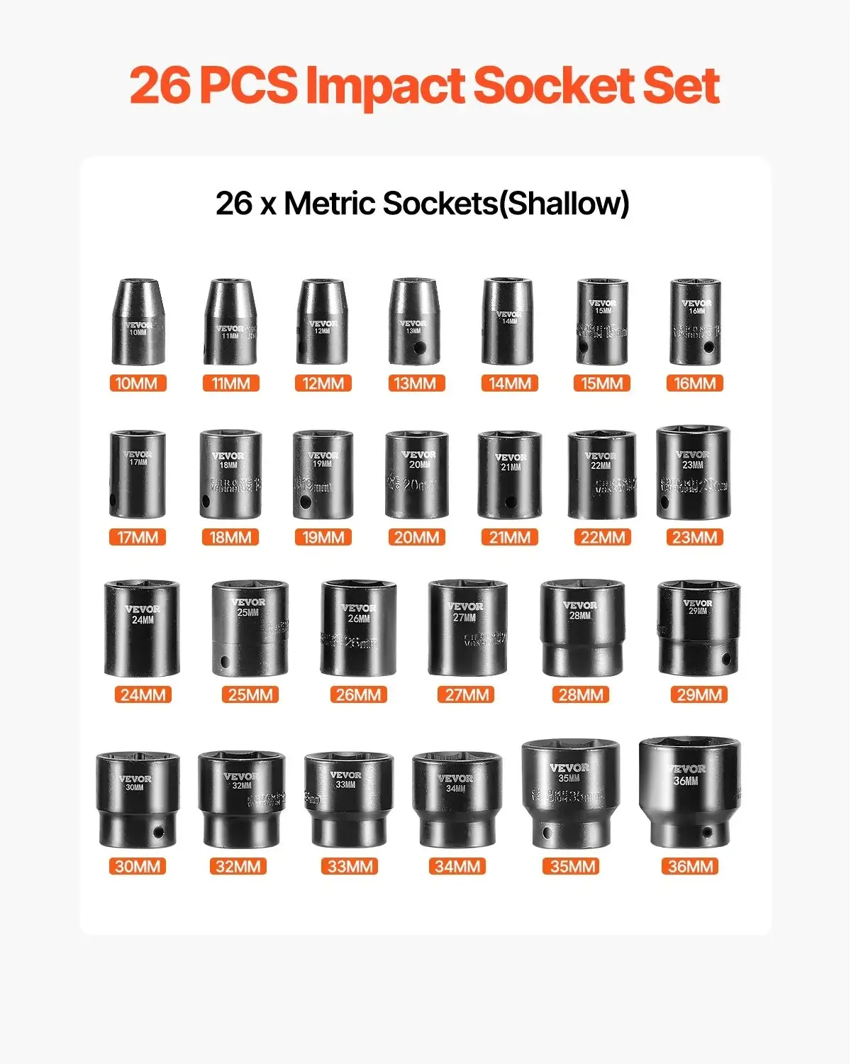 ¡The set includes 26 shallow impact drive sockets ranging from 10mm to 36mm. This effort-saving 1/2 inches drive set is perfect for mechanics, providing a wide range of sizes for various tasks.