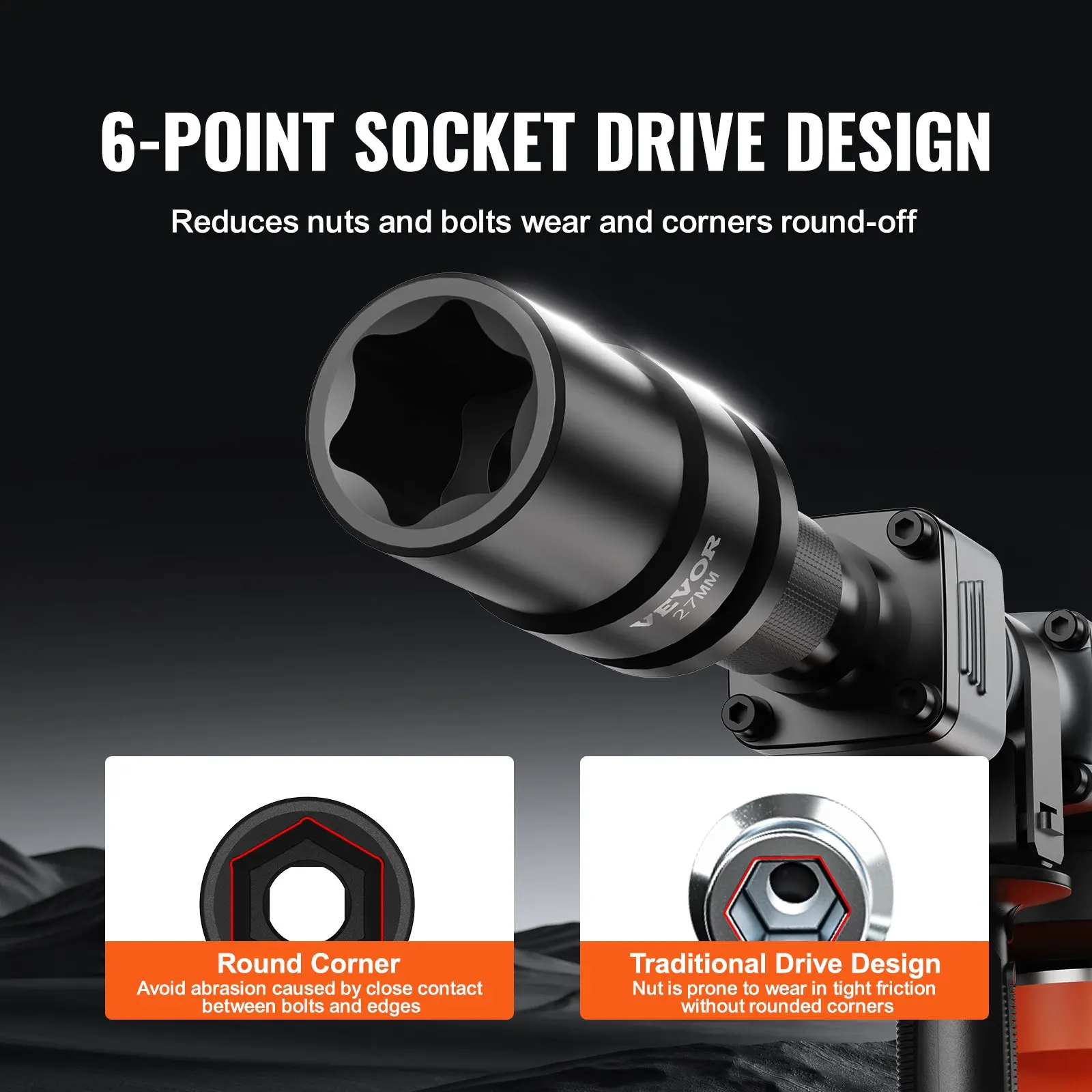 ·High Torque: Distinguished by its hexagonal drive design, which sets it apart from traditional designs lacking rounded corners, this socket tool set significantly reduces pressure exerted on fasteners during impact. As a result, it minimizes wear and effectively prevents bolt rounding and stripping.