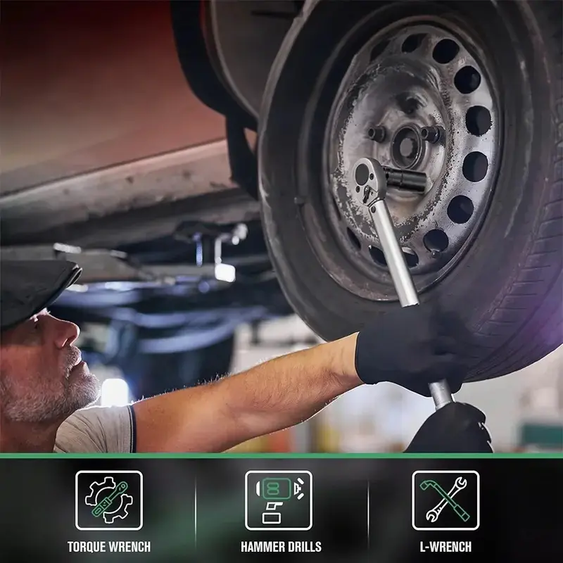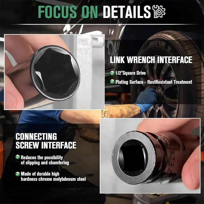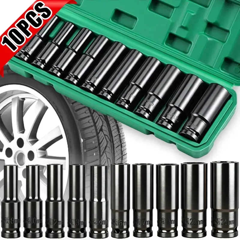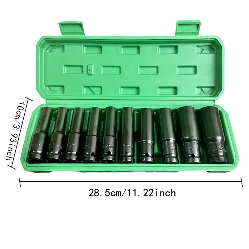 12 Drive Impact Socket Set·10 Sockets and Driver Tool Kit This set includes 10 sockets and a driver tool, perfect for mechanics. 🛠️·Standard Metric Size (8-24mm) The set features a range of metric sizes, from 8mm to 24mm, for versatile use. 📏·Plastic Tool Case Comes with a plastic tool case for easy storage and organization. 📦Product Features·Manual Electric Dafei Wrench The set includes a manual electric Dafei wrench for extended socket use. 🛠️·Deep Impact Socket Set This is a deep impact socket set, ideal for driving tasks. 🛠️·Hexagonal Air Screwdriver Air Cannon Tool The set also includes a hexagonal air screwdriver and air cannon tool. 🛠️Specifications·Material CR-MO. 🛠️·Sizes 15mm, 17mm, 19mm, 20mm, 22mm, 23mm, 24mm, 27mm. 📏·Type Metric drive socket set. 🛠️