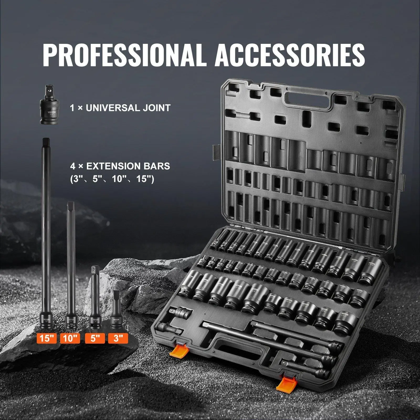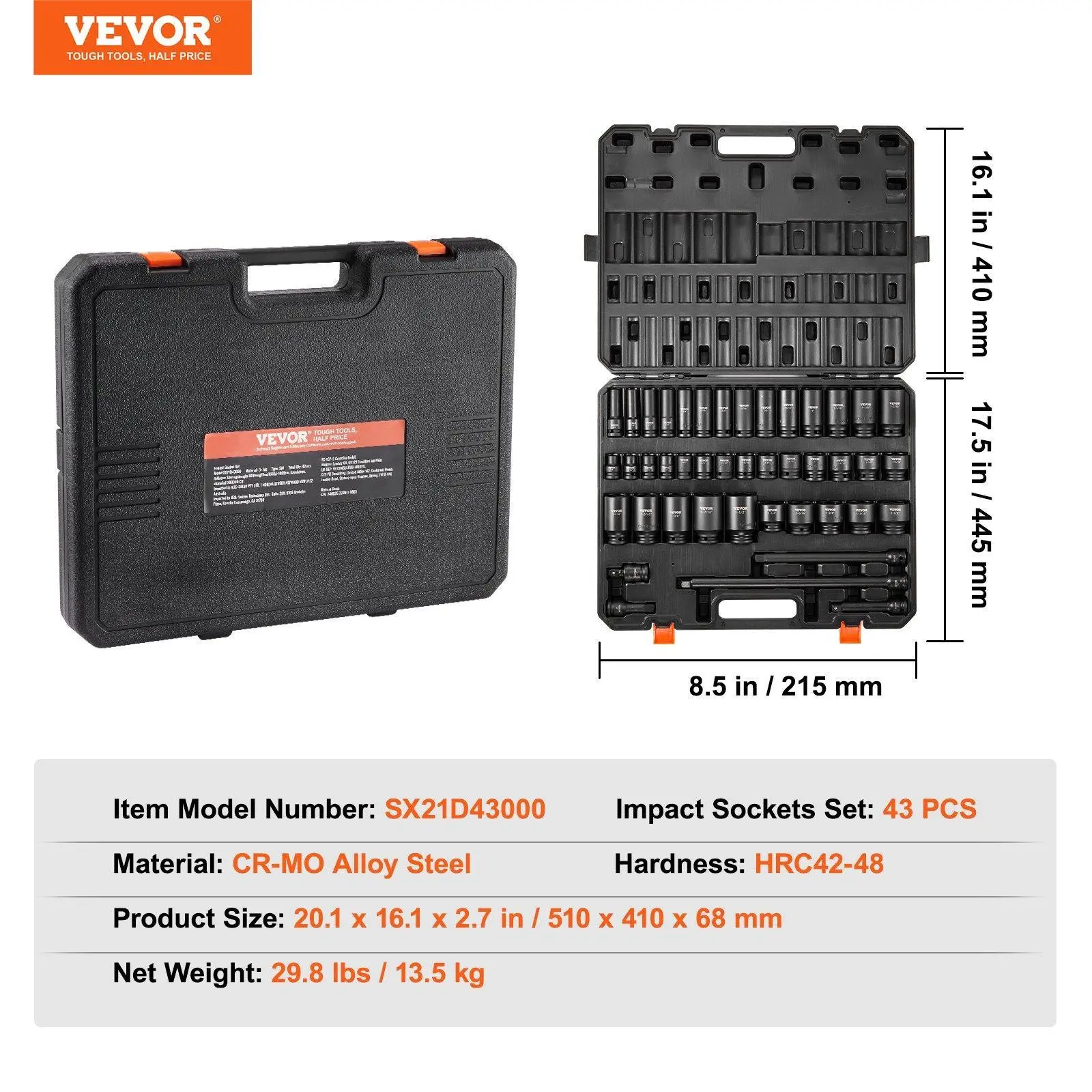 5. VEVOR Impact Sockets Set 43pcs 6-Point 1/2in Drive Bit Ratchet Tool Kit Case