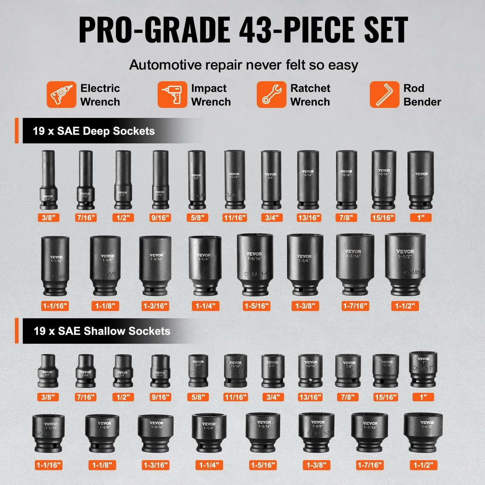 ·Abundant Components: This comprehensive set includes 19pcs SAE deep sockets and 19pcs SAE shallow sockets: 3/8", 7/16", 1/2", 9/16", 5/8", 11/16", 3/4", 13/16", 7/8", 15/16", 1", 1-1/16", 1-1/8", 1-3/16", 1-1/4", 1-5/16", 1-3/8", 1-7/16", 1-1/2". It also includes 4 extension bars (3", 5", 10", 15") and a universal joint.