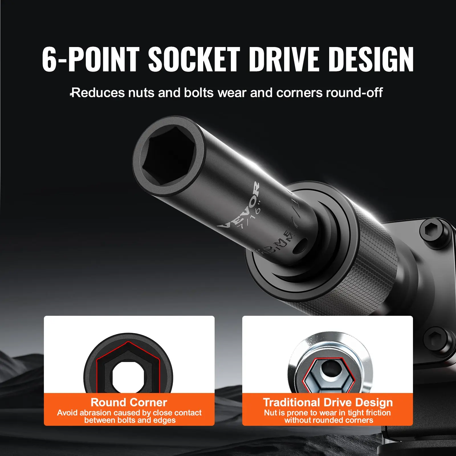 ·High Torque: Distinguished by its hexagonal drive design, which sets it apart from traditional designs lacking rounded corners, this socket tool set significantly reduces pressure exerted on fasteners during impact. As a result, it minimizes wear and effectively prevents bolt rounding and stripping.