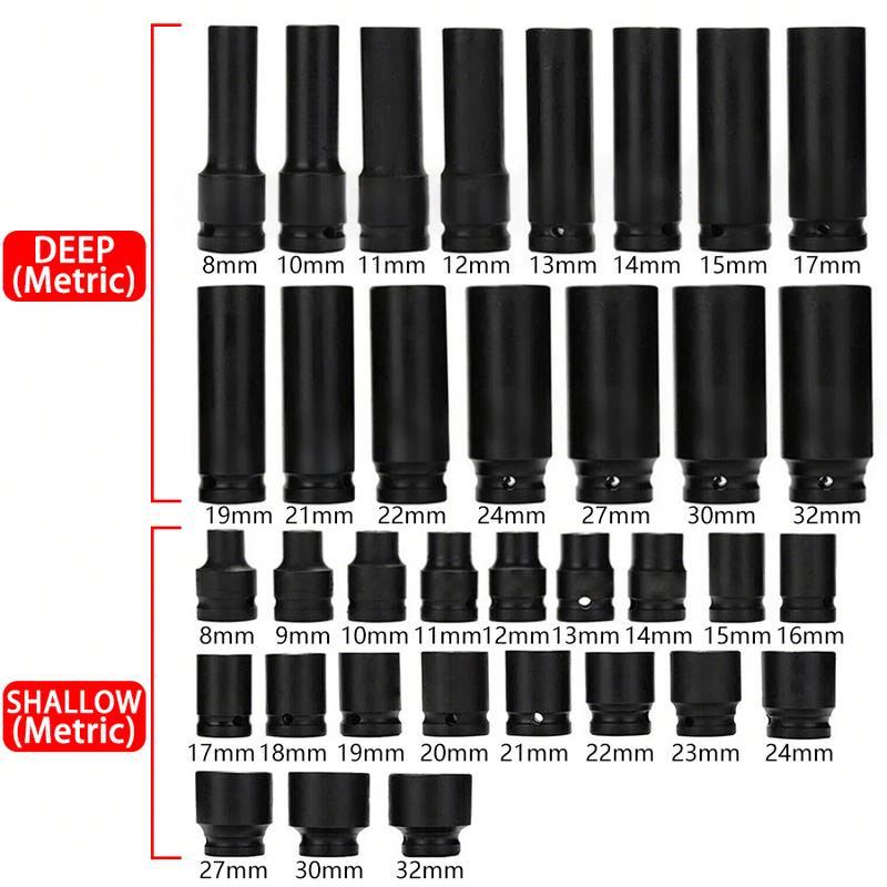 Set Includes: 35-piece 1/2-inch drive Deep impact sockets: 8-10-11-12-13-14-15-17-19-21-22-24-27-30-32mm; & Shallow impact sockets:8-9-10-11-12-13-14-15-16-17-18-19-20-21-22-23-24-27-30-32mm, 35PC,1-piece Storage case.