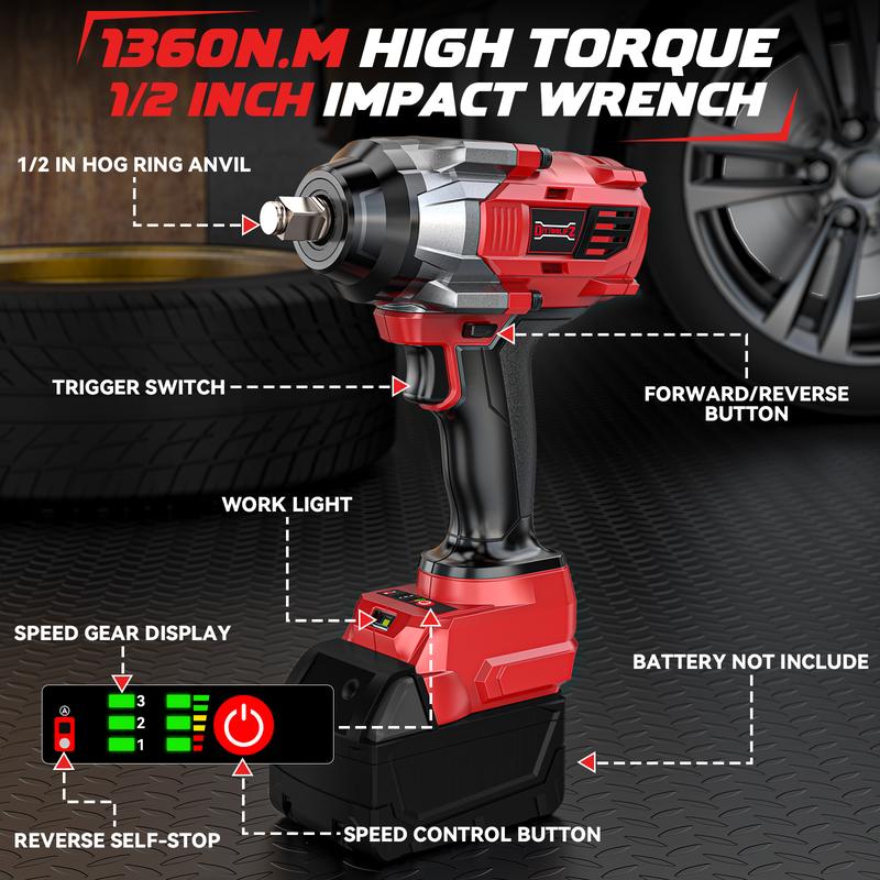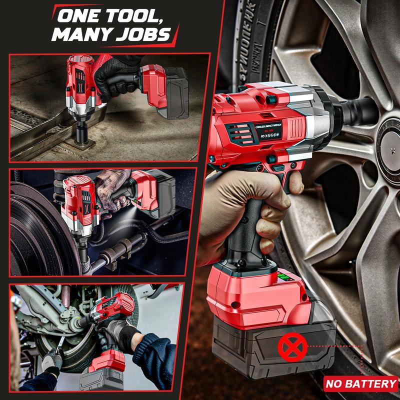 Our cordless impact wrench is compatible with Milwaukee 18V batteries (Battery NOT included!), eliminating the need for cords and outlets. The built-in low-voltage protection safeguards both your tool and battery during extended use.