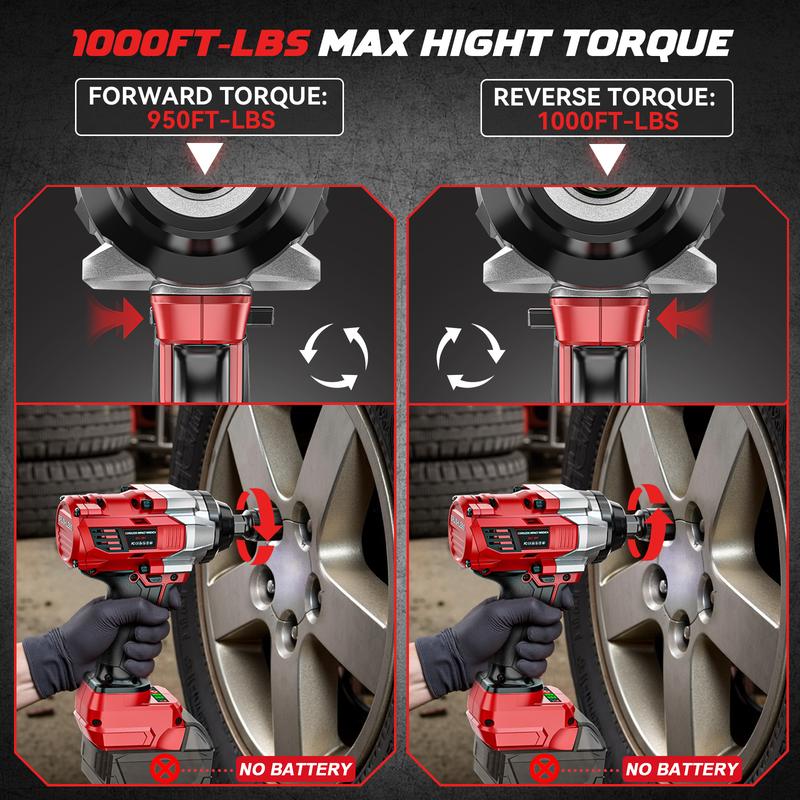 Experience cutting-edge efficiency with our 1/2 inch impact wrench. Its advanced brushless motor delivers up to 950 ft-lbs tightening torque and 1000 ft-lbs loosening torque—ensuring longer runtimes and lower heat buildup. Tightening and loosening fasteners becomes a breeze, saving you time and effort every time.