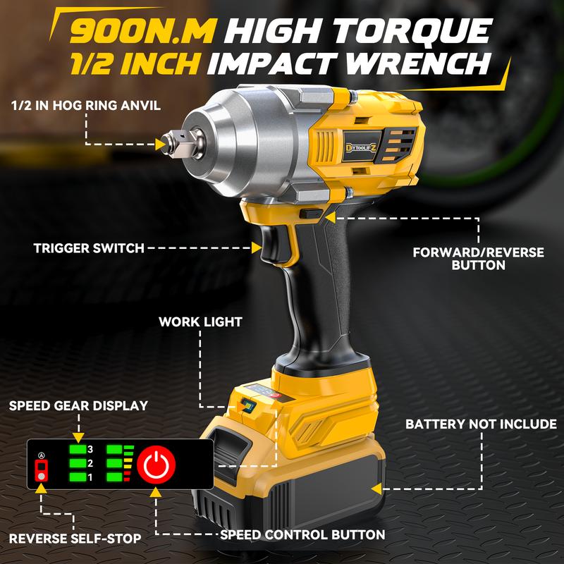·Variable Speed & Brushless Motor: Increase your productivity with DIYtoolifz High-Torque Impact Wrench, featuring 3 forward speeds, 1 reverse speed, and auto-stop, achieve precise control from 0-2400 RPM. Say goodbye to over-tightening with built-in safeguards.The highly efficient Brushless Impact Wrench for DEWALT enjoys 60% longer run time than traditional motors.