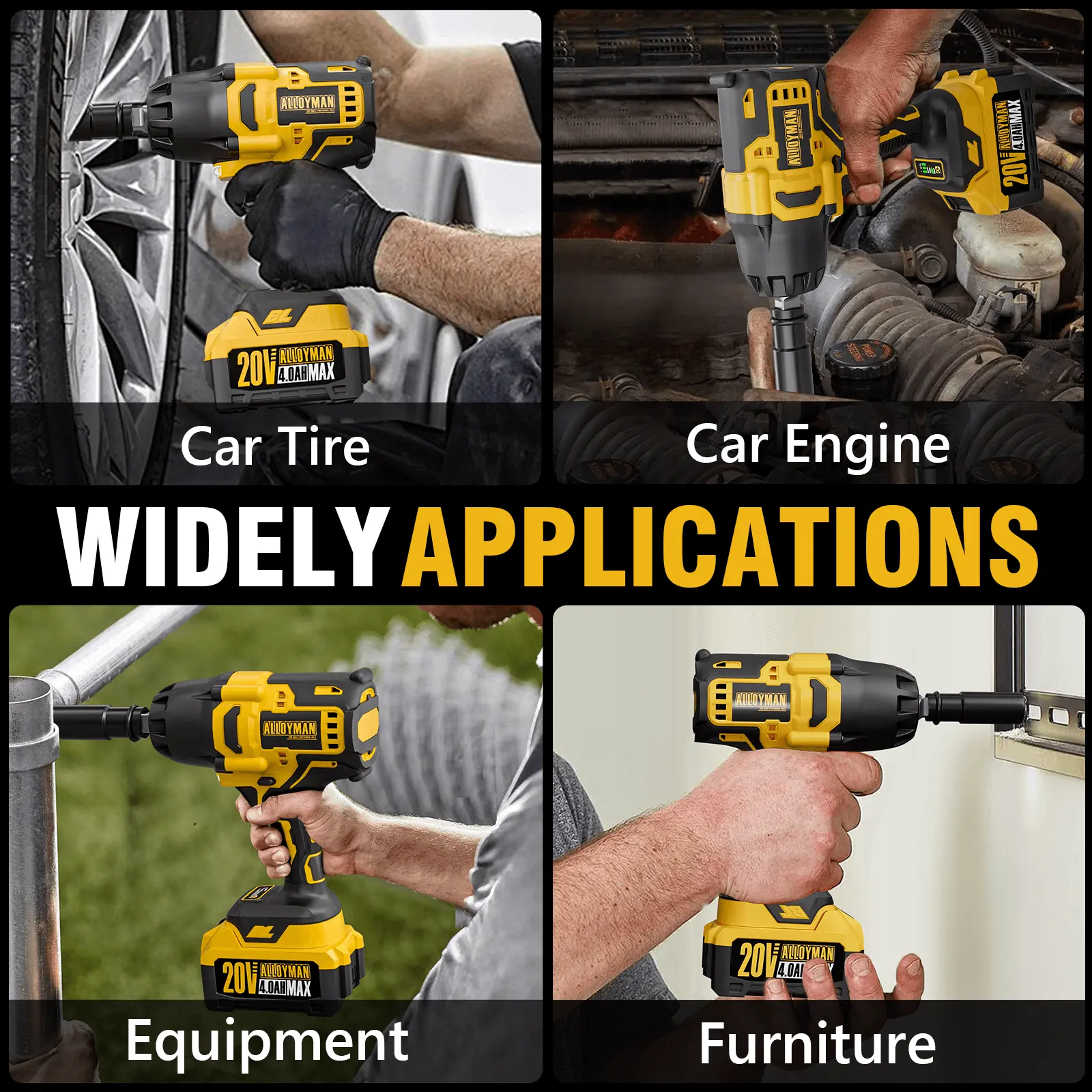 Widely Application - 3-speed Mode: Saves time on hard work, such as removing tires from cars, trucks, and trailers. - Versatile Use: Ideal for car repairs, large construction projects, heavy equipment maintenance, and product assembly.