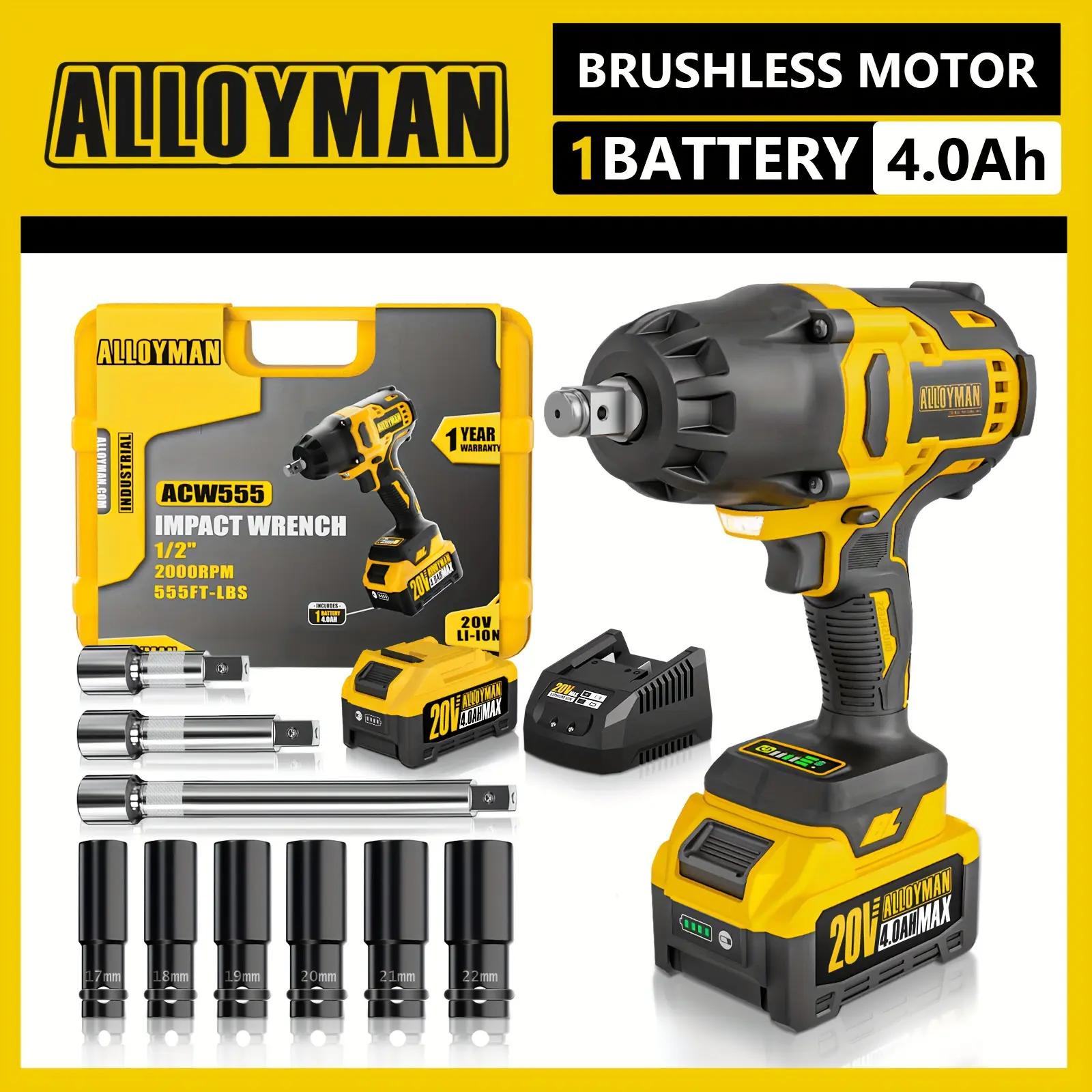 Power and Convenience- 20V Brushless Motor: Provides 2 times power than traditional brushed motors. - 2000 RPM: Maximum speed to meet various work requirements. - 4.0 AH Li-ion Battery: Includes 2 batteries and a fast charger for quick charging. - Accessories: Comes with 6 impact sockets (17mm-22mm), 3 extension bars (3-in, 5-in, 10-in), and a suitcase.