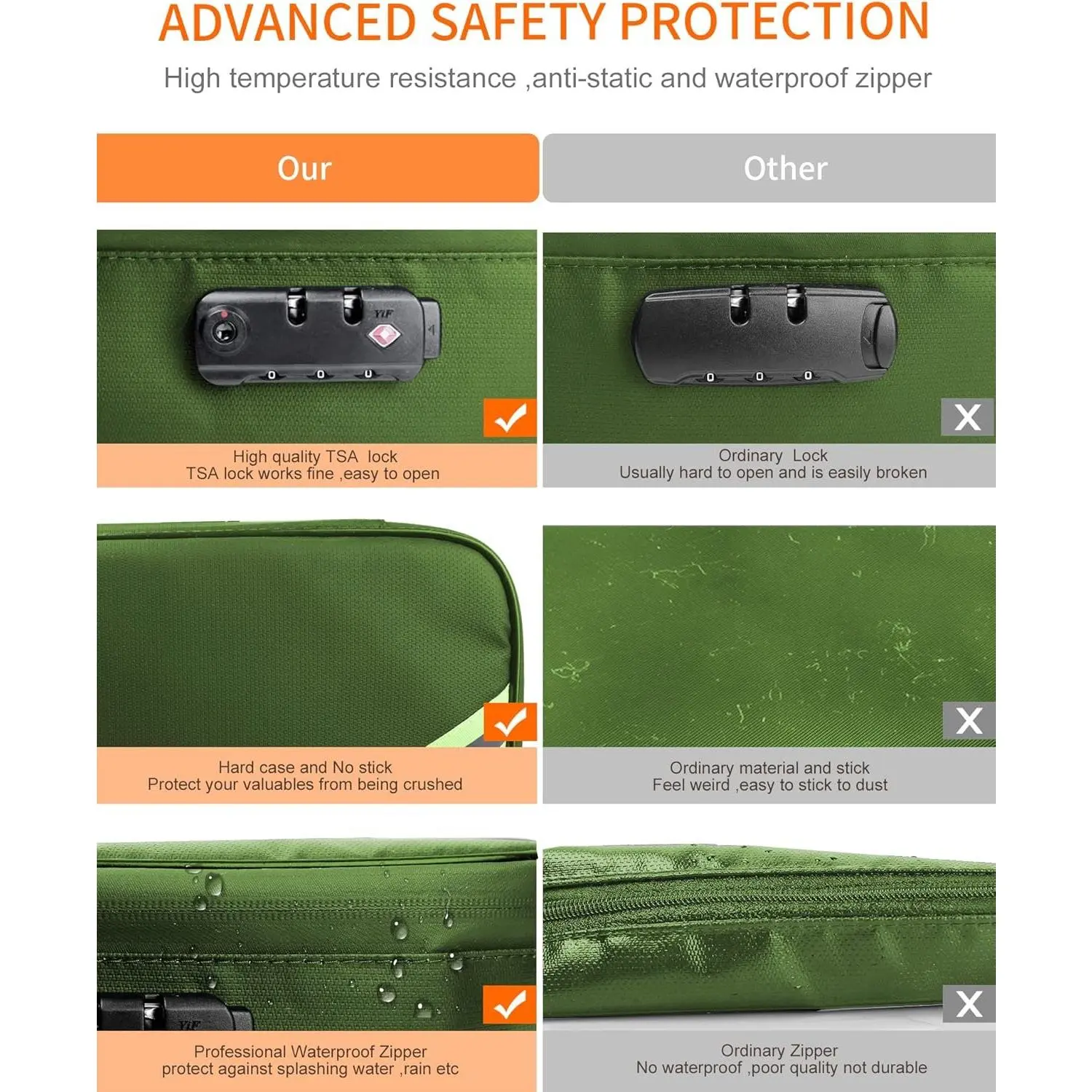 Non-stick Material and Water Resistant Zipper: through the unremitting efforts of technicians, now they have developed a non-sticky anti-static material for lock box for documents .We don’t worry that the ’s hair and dust or dirt particles would immediately stick to it.Meantime, the Sealed zippers of important document storage are totally water resistant which can survive the of firefighter's hose full blast, provides seal and maximum protection for our documents