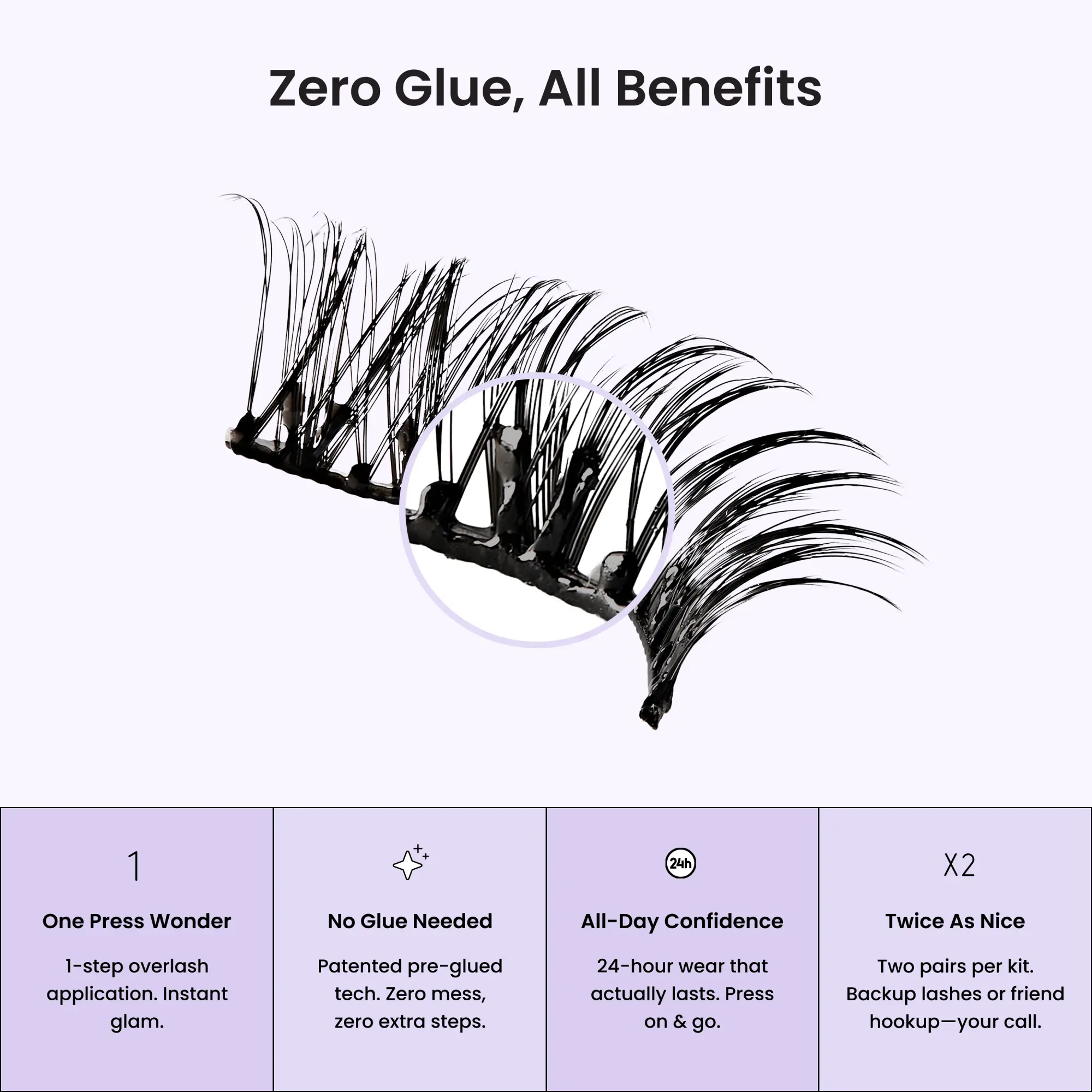 ·Fastest overlash application: pre-glued strip lashes go on in one step in just seconds