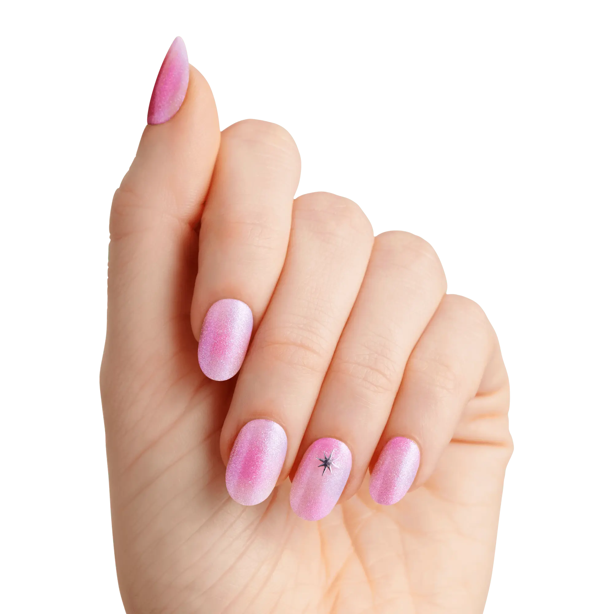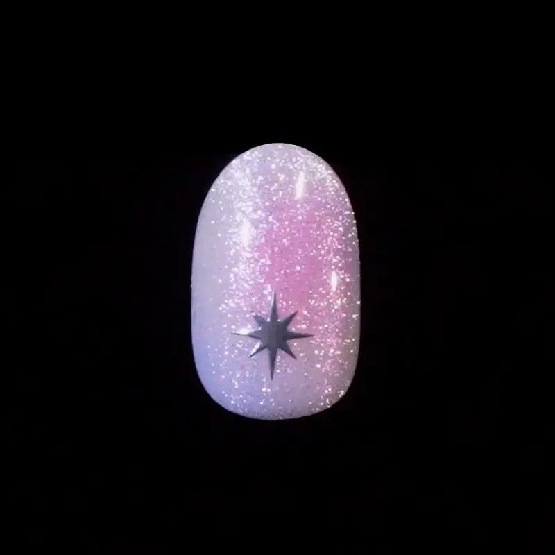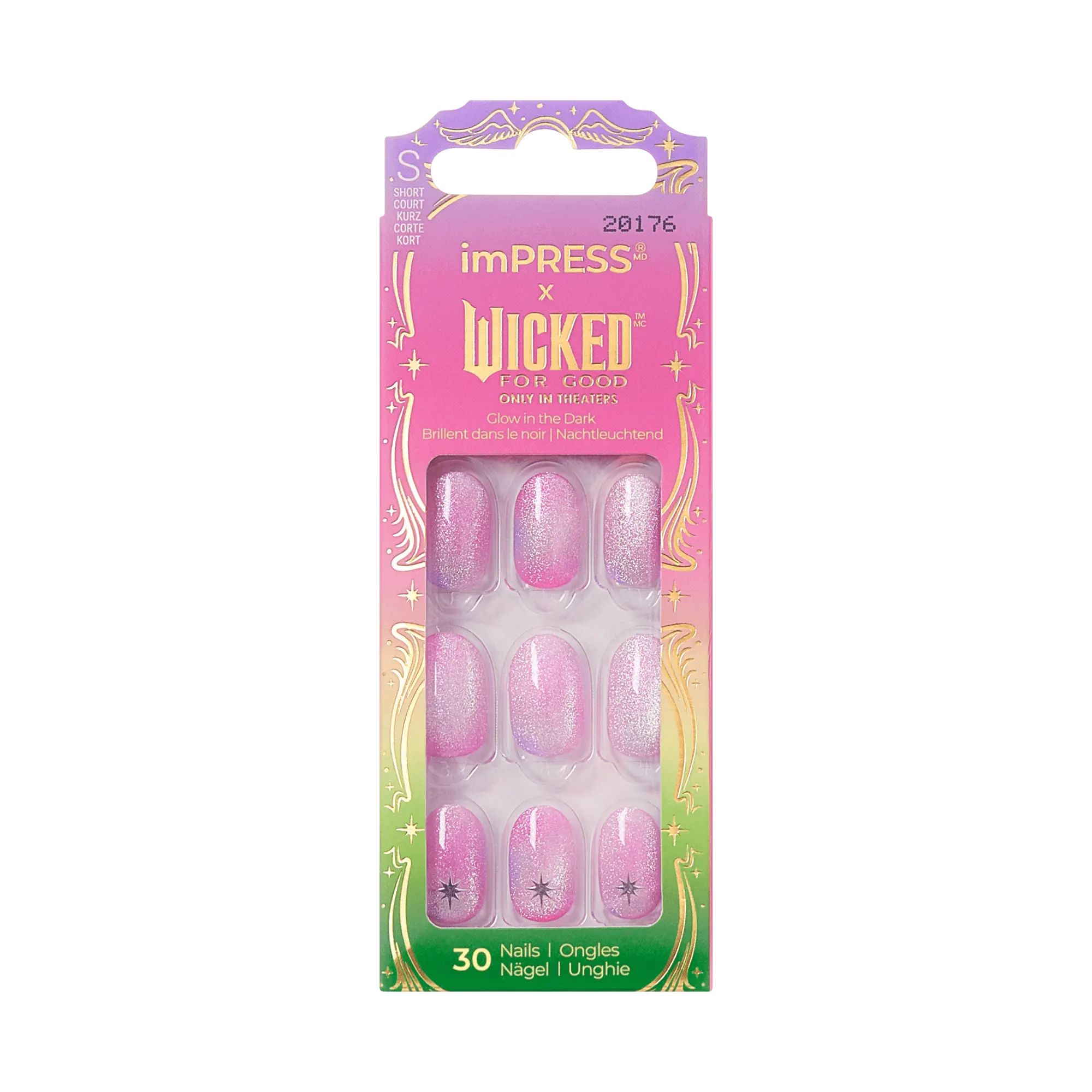 Spellbinding light pink glow-in-the-dark press on nails feature magical marble magnetic powder effect & a bewitching silver star. Let your dreams take flight with Wicked x imPRESS NO GLUE Mani Collection. Just peel, press & go!