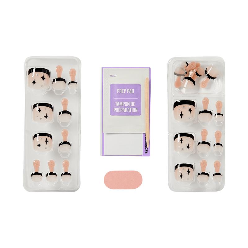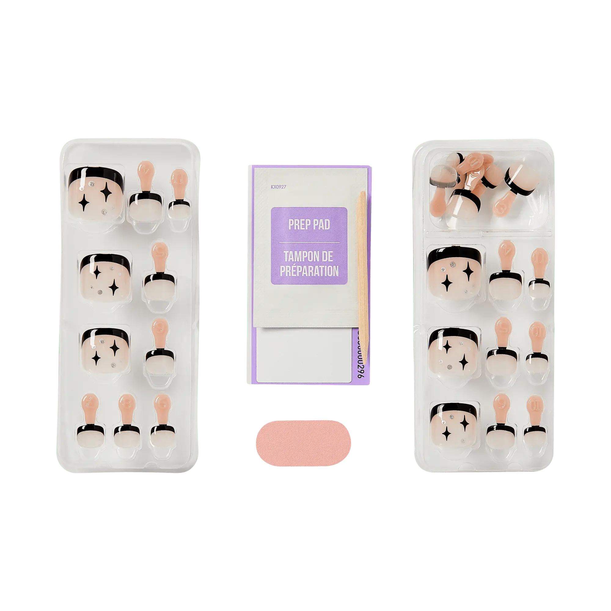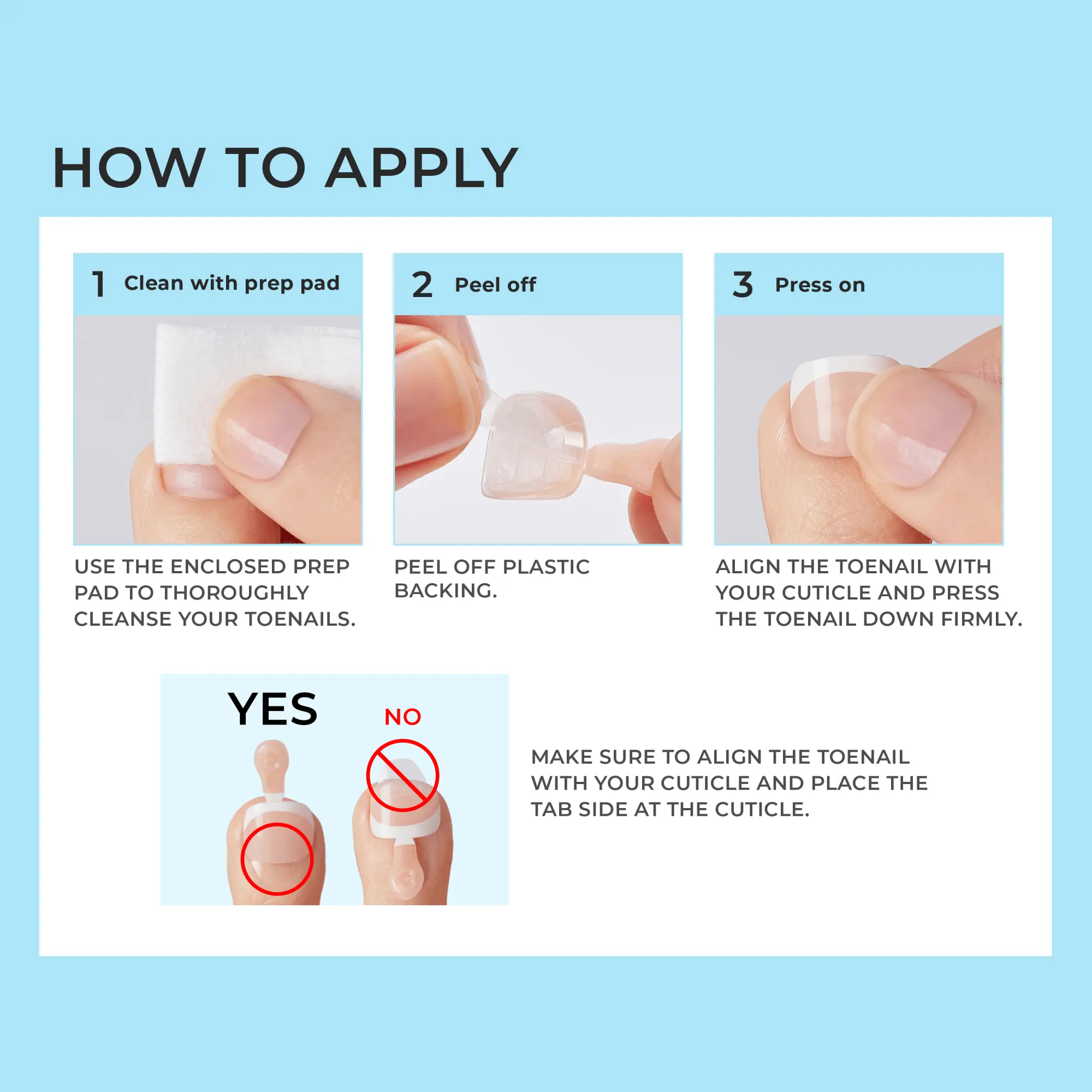 ·Pedicure kit contains 24 press on toenails, prep pad, mini nail file, and pedicure stick
