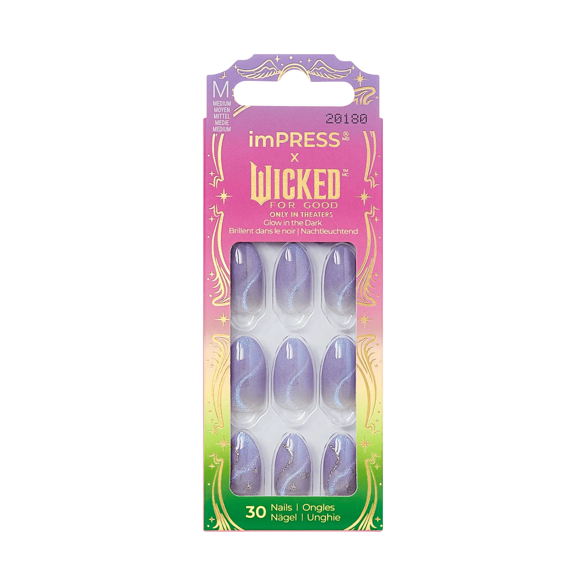Defy gravity with light purple press on nails featuring a thrillifying swirl magnetic powder effect and a mesmerizing glow-in-the-dark design inspired by ‘Wicked: For Good’. Shine like Glinda with the easiest NO GLUE mani from the Wicked x imPRESS Collection!