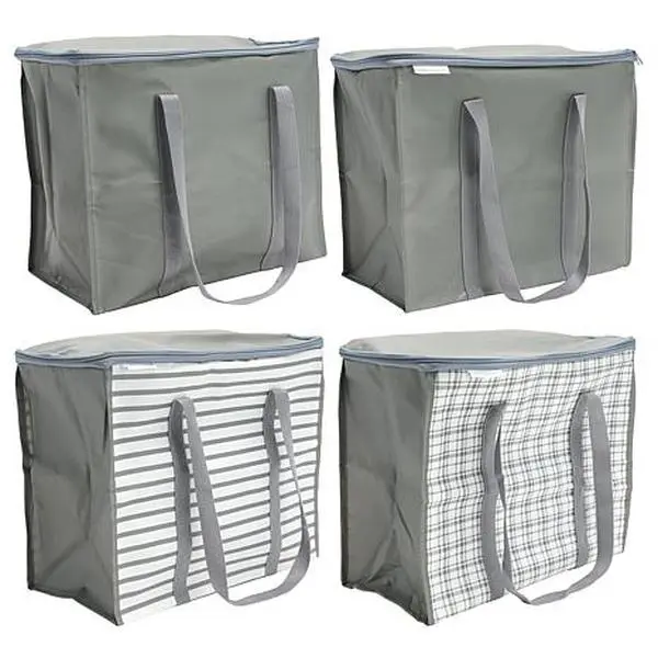 Improvements 7-Gallon Zippered Totes Set of 4 Each bag features a flat bottom and square sides, so they resist falling over the trunk of your car. They have two zippers so you can open it from anywhere across the top. The interior is waterproof in case something spills, and the strap handles are reinforced so each bag can handle up to 45 pounds of whatever you choose to haul in it. From grocery runs to soccer games to visits to the family for a celebration, Improvements has you covered. And when they are not in use, each bag folds flat for easy storage.  What You Get (4) 7-Gallon zipper totes with reinforced strap handles and dual-headed zippers Good to Know Each bag and the strap holds up to 45 lbs. Water-resistant liner. Food-safe interior. Each bag holds up to (54) 12 oz. cans.