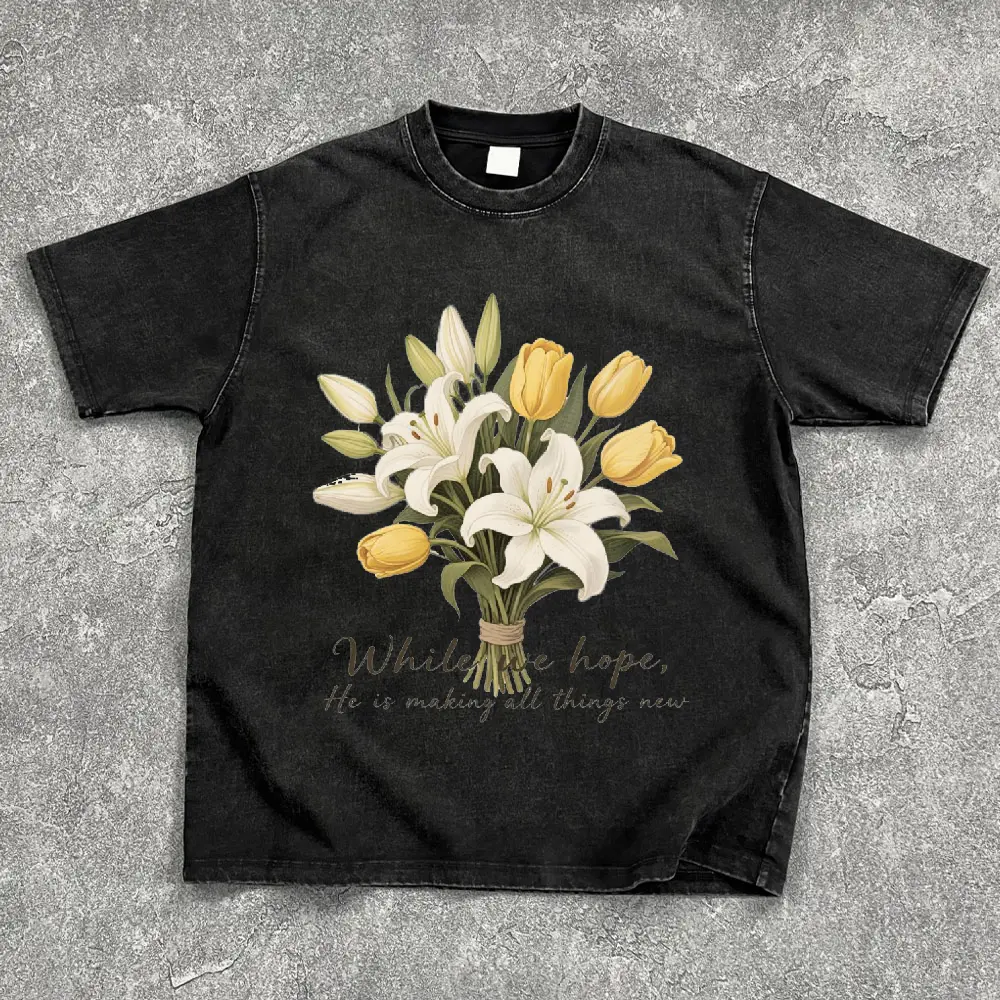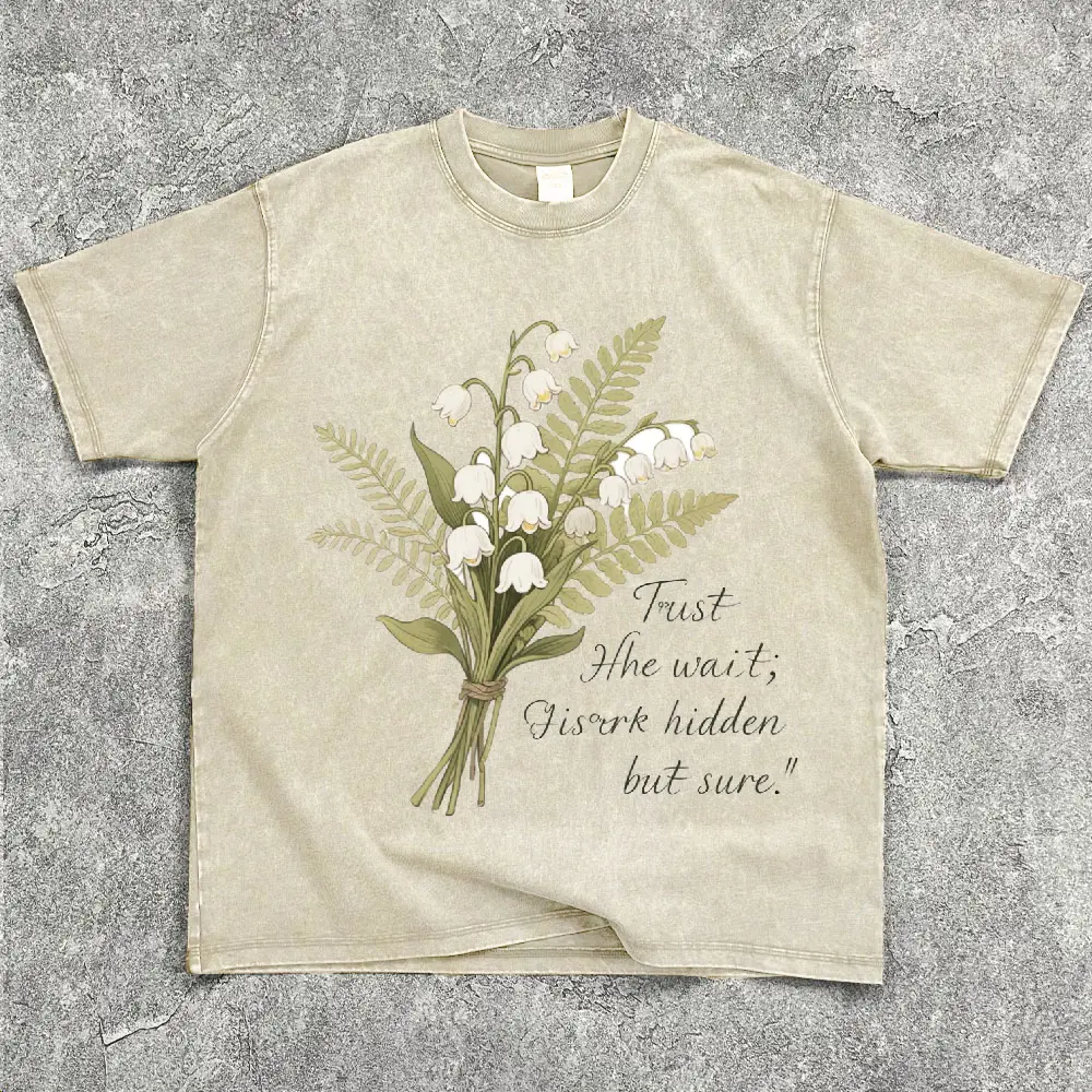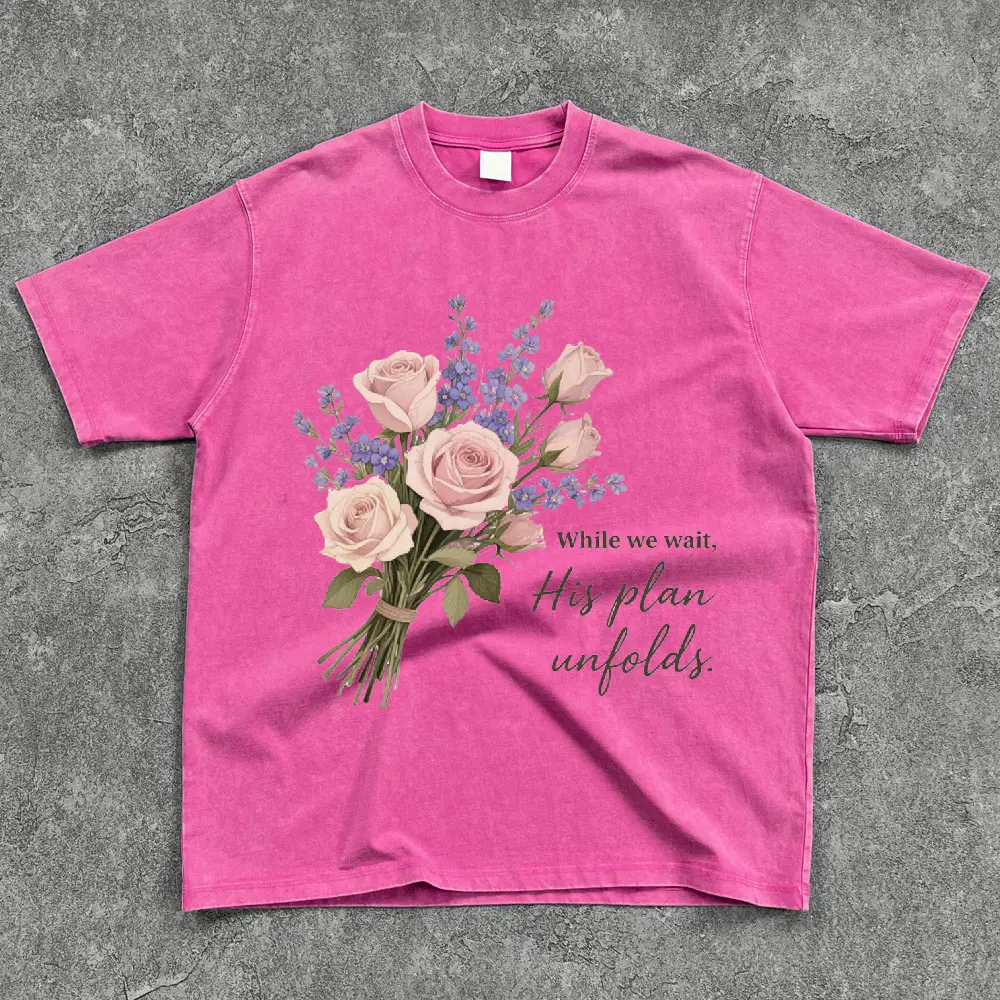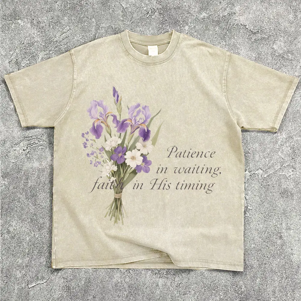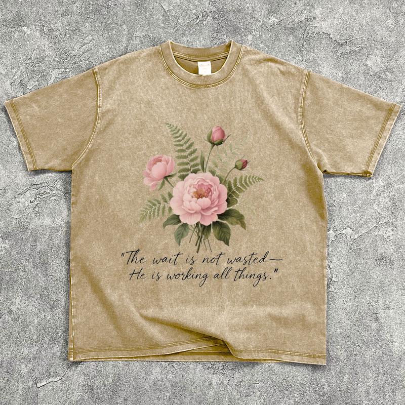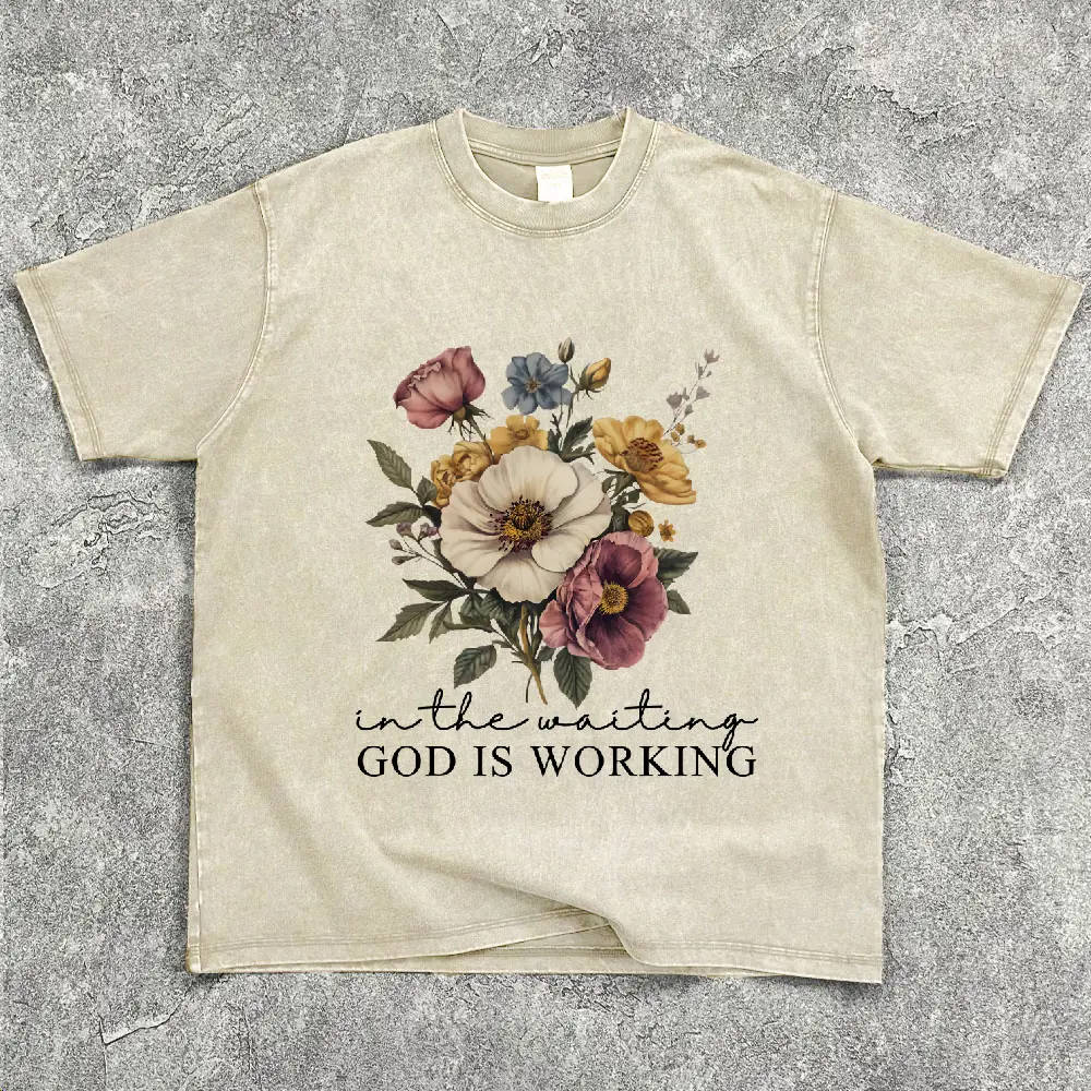 In the Waiting God is Working Washed T-Shirt Women's Vintage Floral Christian Tee Soft Breathable Unisex Loose Fit Casual Everyday Wear Print Tops Womenswear