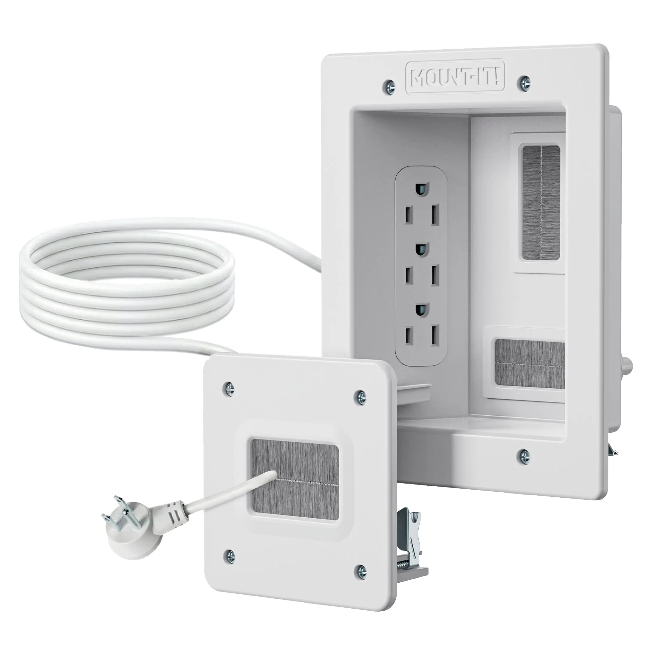 The In-Wall TV Cable Concealer with Recessed Power is the perfect solution for creating a clean and sleek entertainment space by hiding unsightly cables behind the wall. This innovative product provides recessed power, allowing you to power up to three devices with its convenient triple-outlet design and the pre-wired 9ft cord. It also features an additional brush pass-through, making it easy to manage low voltage cables for a clutter-free setup. Installation is quick and straightforward, with all required tools included for your convenience. Plus, it is ETL certified to meet industry safety standards, ensuring a safe and reliable installation. Transform your entertainment area with this efficient and stylish cable management system.
